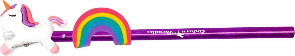 - HB Bleistift in Glitzer-Folie mit Regenbogen-Radiergummi und Einhorn Topper mit integriertem Spitzer