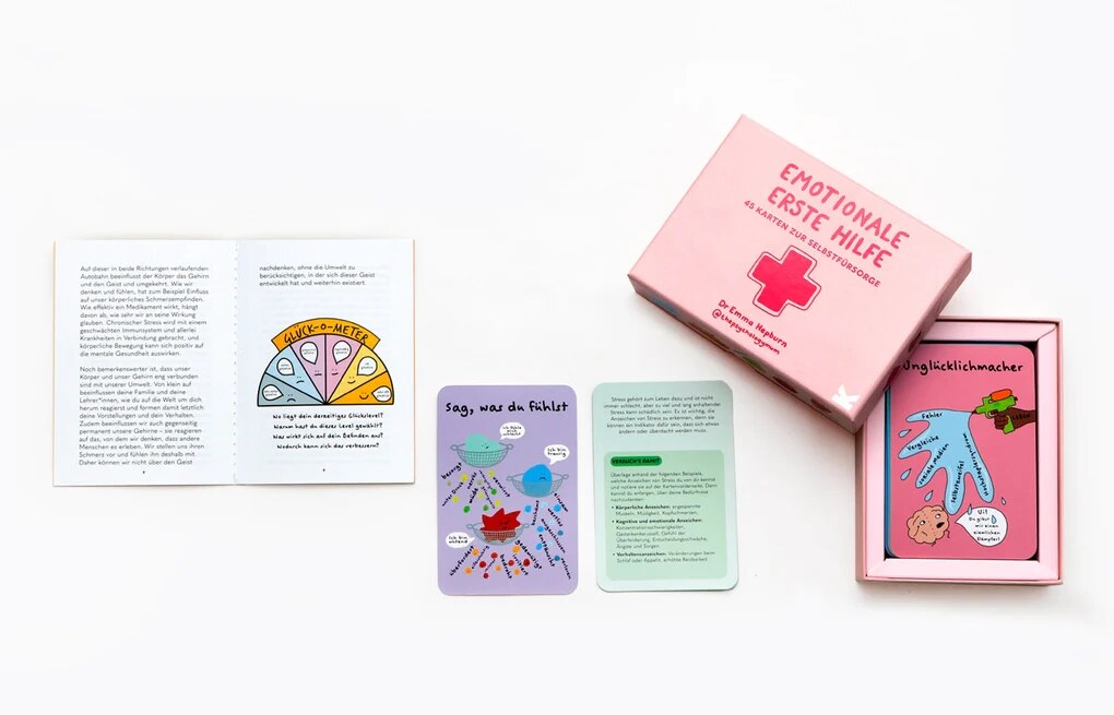 Dieses Kartenset für emotionale Erste Hilfe gibt Dir praktische Werkzeuge an die Hand, die Dir helfen, mit Deinen alltäglichen Gefühlen und Emotionen umzugehen und sie zu verarbeiten – von Stress und Überforderung bis hin zu Traurigkeit und Frustration. Jede Karte gibt Anregungen, wie Du Deine Emotionen wahrnehmen und für Dein mentales Wohlbefinden sorgen kannst.