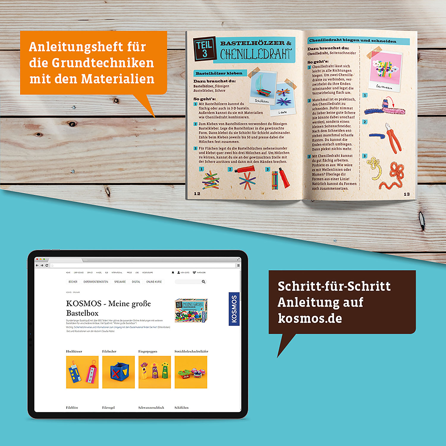 - Ausführliche Anleitung: Die Grundtechniken werden in der farbigen Anleitung anschaulich erklärt. Jede Menge Bastelprojekte mit Schritt-für-Schritt Anleitung gibt es auf kosmos.de.