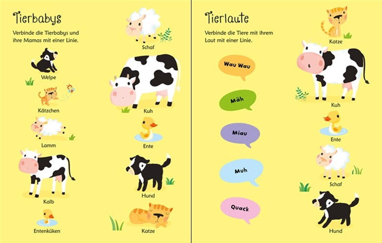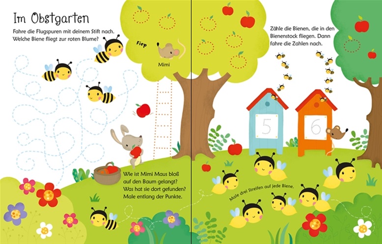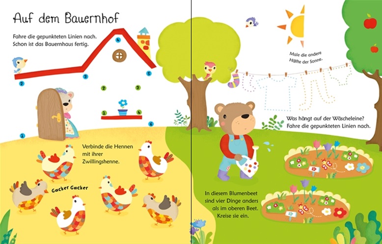 Dem Bauer auf seinem Traktor den Weg nach Hause zeigen. Den Blumen ihre Blütenblätter malen. Jede Menge Zuordnungs- und Schwungübungsspass für Kinder im Vorschulalter. Und falls doch mal was danebengeht: einfach wegwischen und von vorne starten.