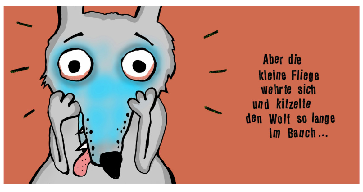Wenn der Wolf grossen Hunger hat - ein Happs, noch ein Happs und noch einer: Ein Spielzeug nach dem anderen verschwindet im Schlund des hungrigen Wolfs. Am Schluss kommt auch noch die kleine Fliege an die Reihe, aber die weiss sich wehrhaft zu helfen.