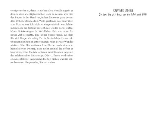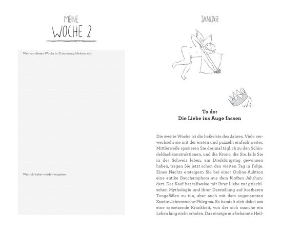 Lukas Linder hat uns einen ganz persönlichen Jahreskalender beschert. Mit 52 kurzen Kapiteln führt er uns auf eine Reise zu uns selbst. Dabei stellt er auch immer eine passende Aufgabe, so dass persönlicher Wachstum garantiert ist. Und weil es Lukas Linder ist, der uns diese kurzen Kapitel schreibt, schwingt auch stets eine Prise Humor mit – mitunter durchaus auch etwas schwarzer Humor. Schliesslich die beste Art mit dem Leben umzugehen! Gleich bleibt bei jeder Woche die leere Seite zu Beginn, auf welcher «was von dieser Woche in Erinnerung bleiben soll» und «was ich lieber wieder vergesse» notiert werden kann.