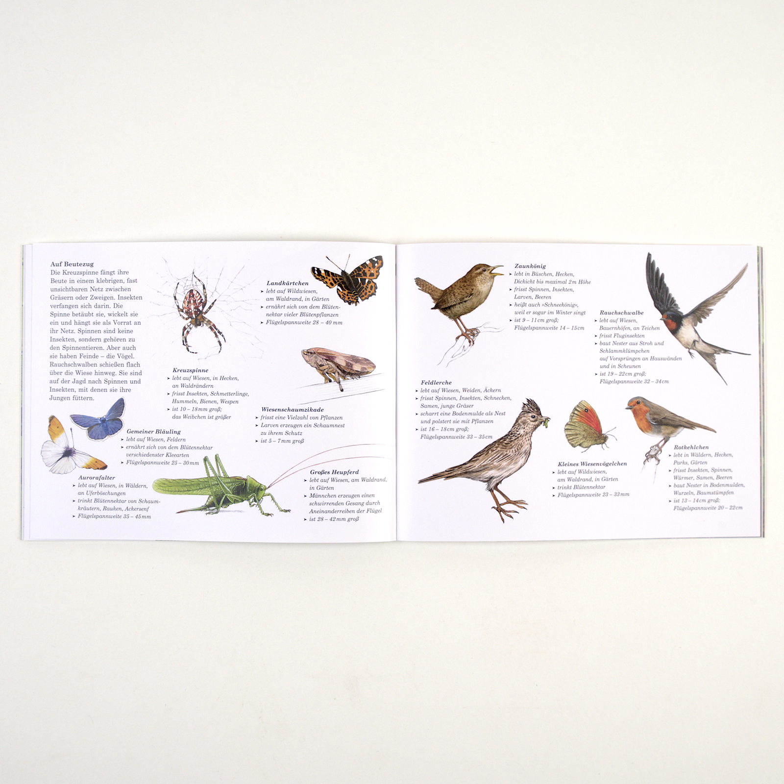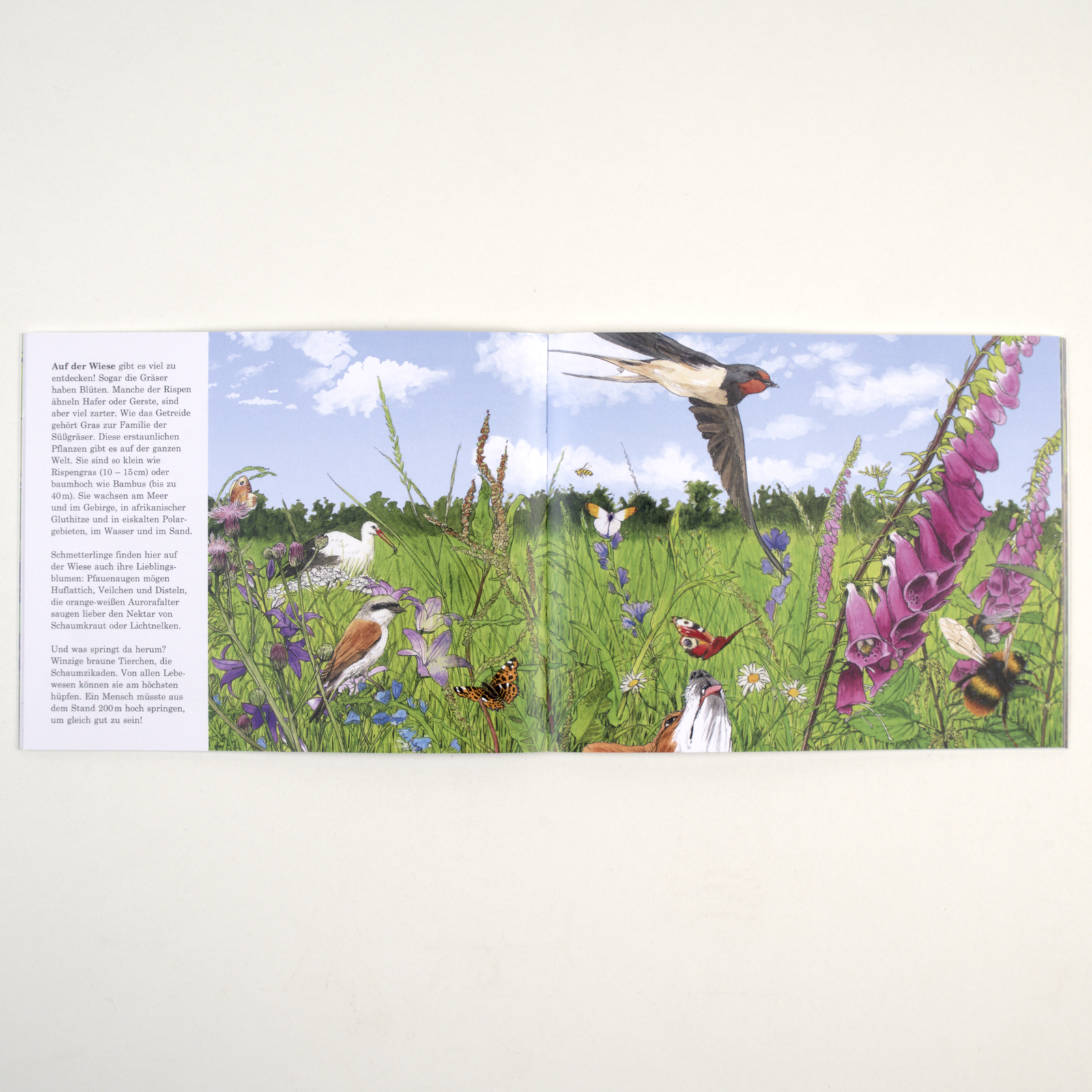 Gemeinsam mit Mäusebussard und Storch nähern wir uns aus der Vogelperspektive an, Seite für Seite, bis wir schliesslich ganz in die Wiese eintauchen. Und entdecken einen lebendigen Kosmos mit über 100 Tieren und Pflanzen.