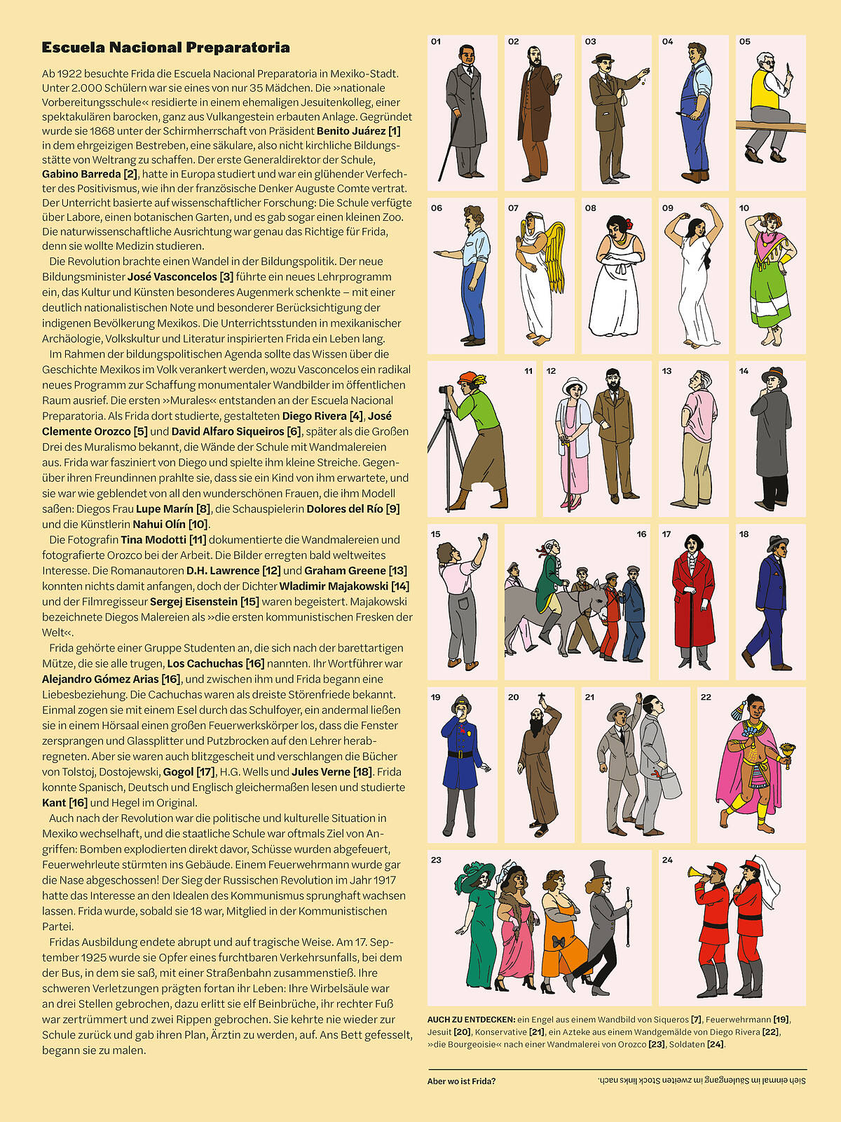 Und ist Frida erst gefunden, kann es weitergehen zur detaillierten Auflösung der Wimmelbilder. Hier informiert Catherine Ingram sachkundig und pointiert über die künstlerischen Szenen und ihre Bedeutung, über die Geschichte Mexikos, die Einflüsse von indigener Tradition und mexikanischer Revolution auf das Werk Kahlos. Hier werden auch die anderen Personen auf den Wimmelbildern beschrieben, die kennenzulernen das Buch zu einer wahren Fundgrube an Geschichten und Anekdoten werden lässt.