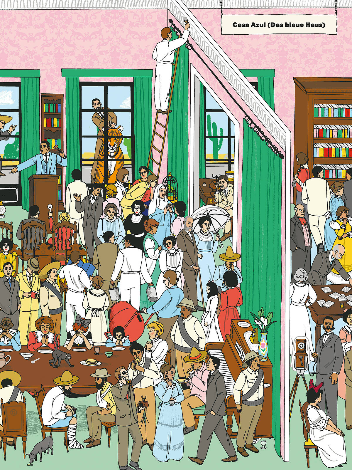 Auf zwölf doppelseitigen Tableaus, die zentrale Wegmarken aus dem Leben Frida Kahlos darstellen, gilt es, die ikonische und extravagante Künstlerin ausfindig zu machen. Doch so einfach ist das nicht: Ob im Blauen Haus, auf ihrer Hochzeit mit Diego Rivera, in ihrem opulenten Garten oder im Krankenhaus, auf Vernissagen in New York und Paris bis zur grossen Retrospektive in Mexiko City, überall ist Frida umgeben von einem ganzen Gewimmel von Leuten, einem veritablen Who-is-Who aus Kunstwelt, Politik und Geschichte.