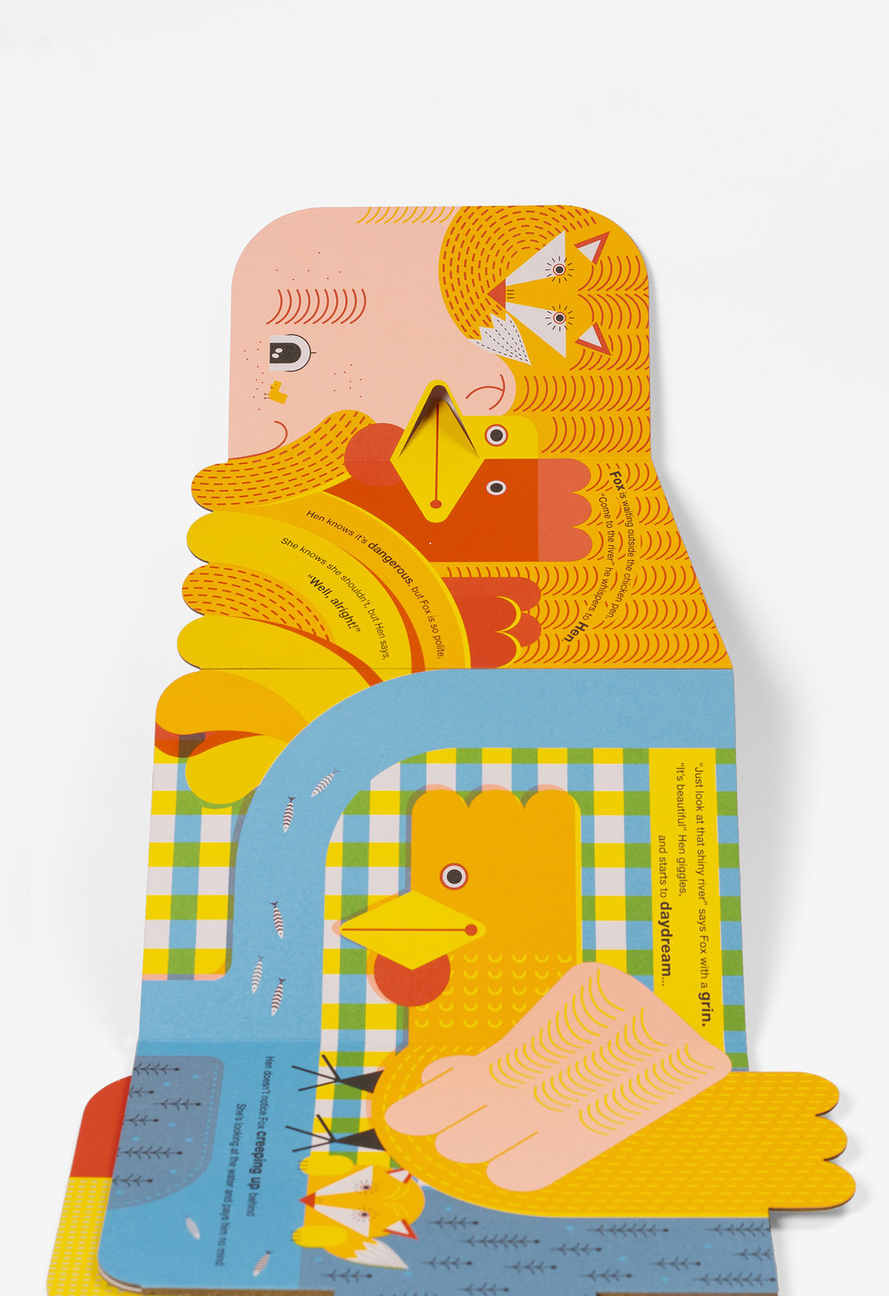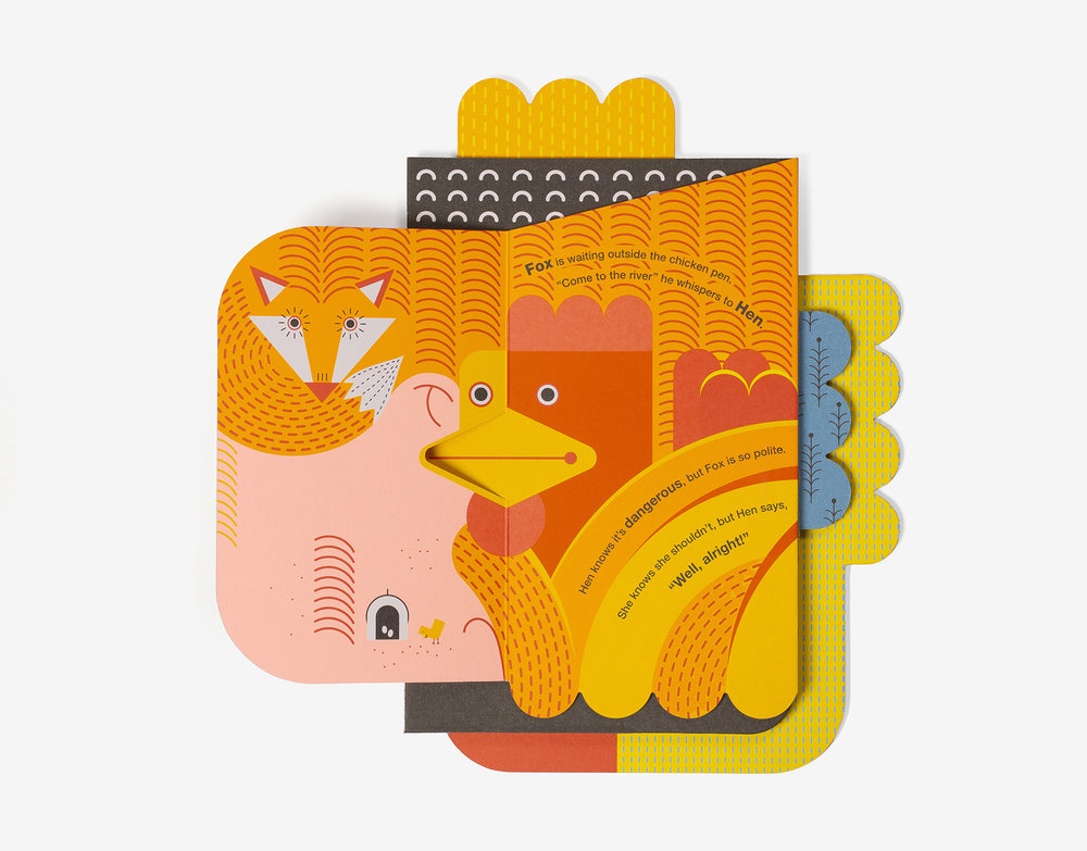 Fuchs will Henne. Zum Glück ist da noch der Bauer! So einfach die Geschichte erzählt ist, umso origineller ist sie umgesetzt ( -> siehe Bilder).
