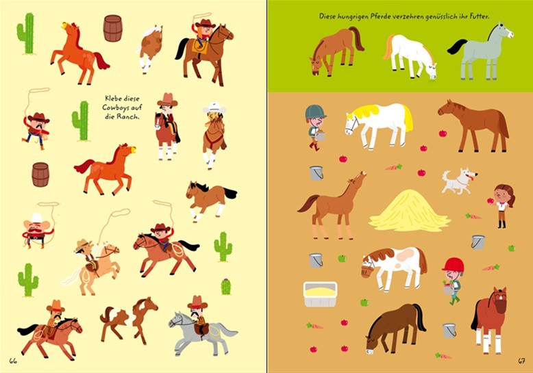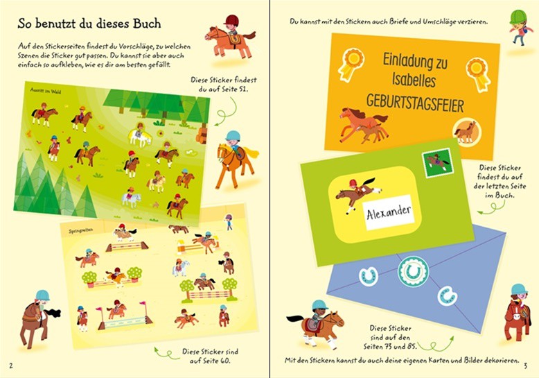 Mit 1000 Stickern kannst du mehr als 20 verschiedene Szenen mit Pferden und Ponys gestalten: Auf der Pferdekoppel, im Reitstall oder beim Ausreiten. Verziere mit den vielen Extra-Stickern Geschenke, Einladungen und Briefumschläge für deine Pferdefreunde.