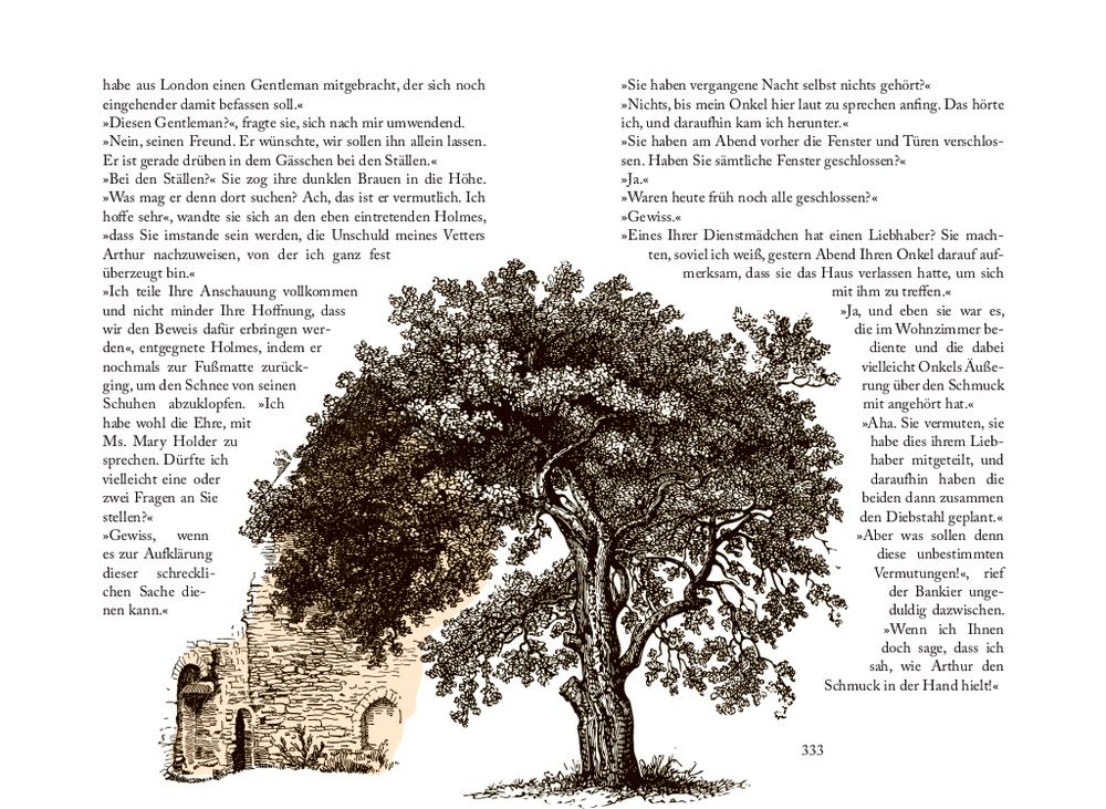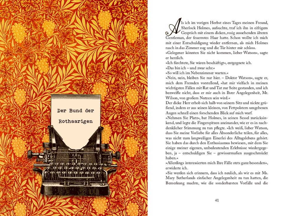 - diese 12 Erzählungen von 1891 – 1892 sind enthalten: ein Skandal in Böhmen, Der Bund der Rothaarigen, Eine Frage der Identität, Das Rätsel von Boscombe Valley, Die fünf Orangenkerne, der Mann mit der entstellten Lippe, Der blaue Karfunkel, Das gefleckte Band, Der Daumen des Ingenieurs, Der adlige Junggeselle, Das Beryll-Diadem, Das Haus mit den Blutbuchen