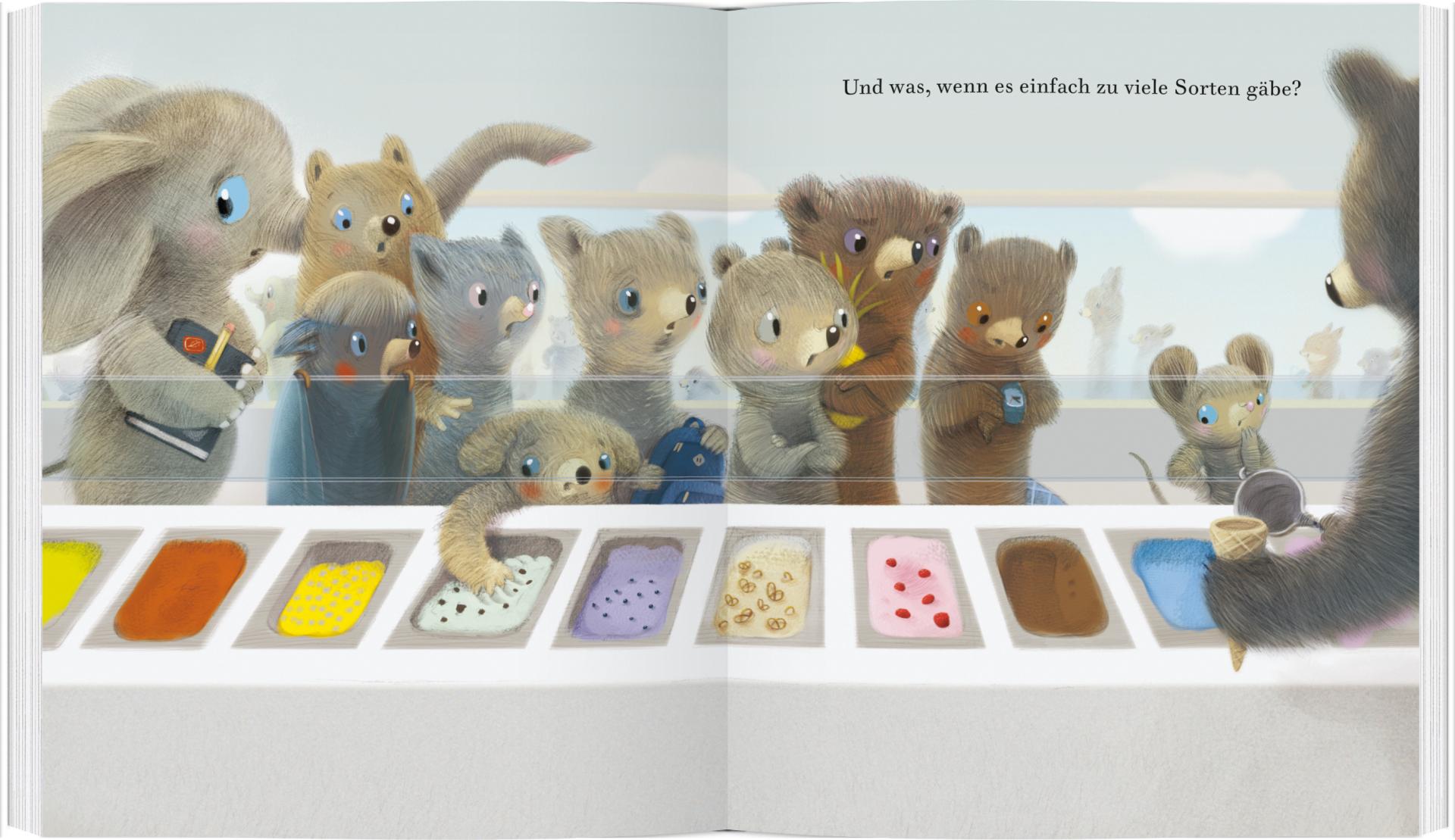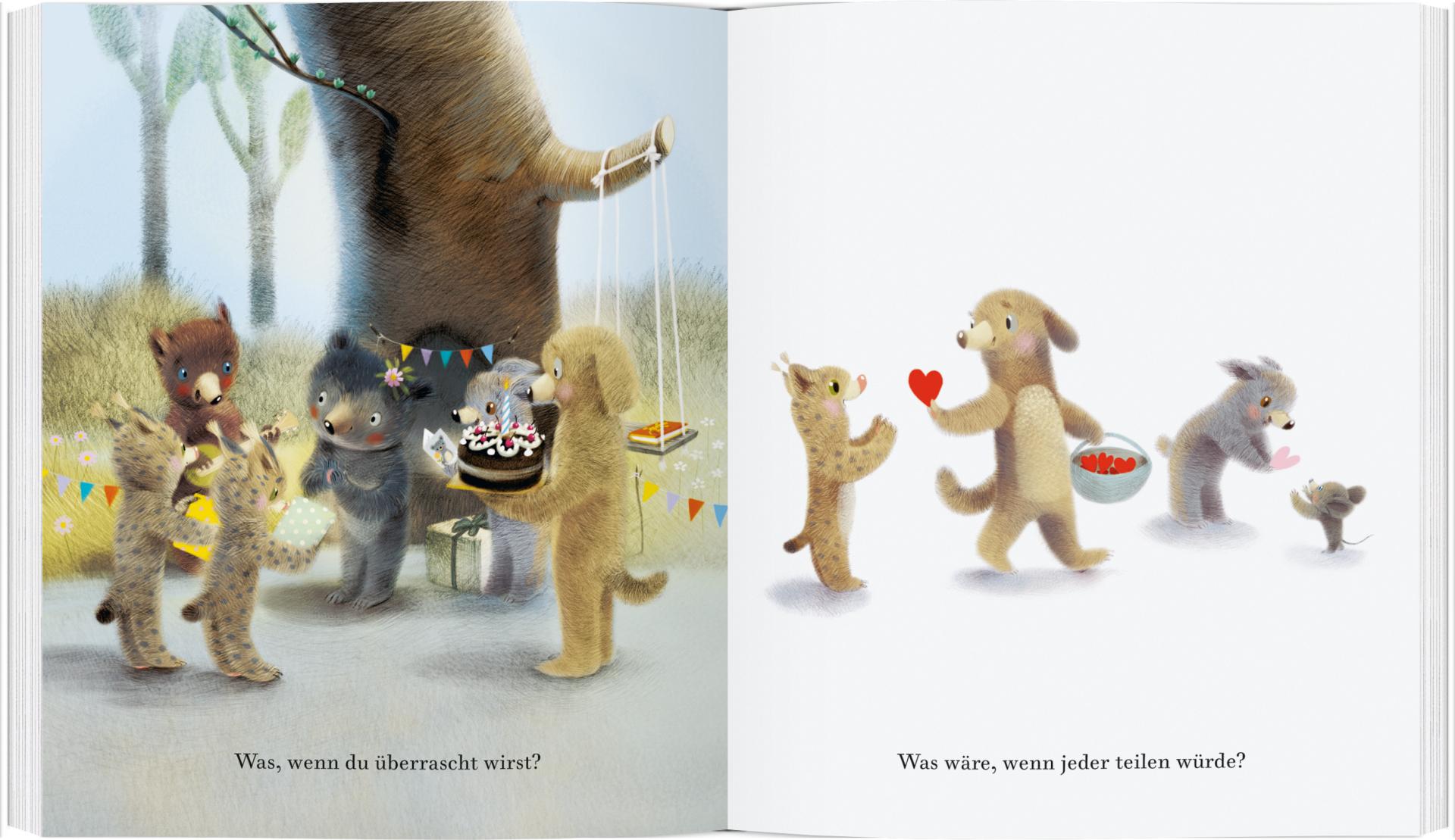 Dieses kleine Buch hat es in sich! Auf 32 Seiten mit megaherzigen Bildern wird munter gefragt. Zum Beispiel: Was wäre, wenn Du zwischen unzähligen Glacesorten wählen müsstest? Was, wenn Du Dich verlaufen hättest? Oder wenn Dir nichts einfallen würde? Und was wäre, wenn alle miteinander teilen würden? Was meinst Du?