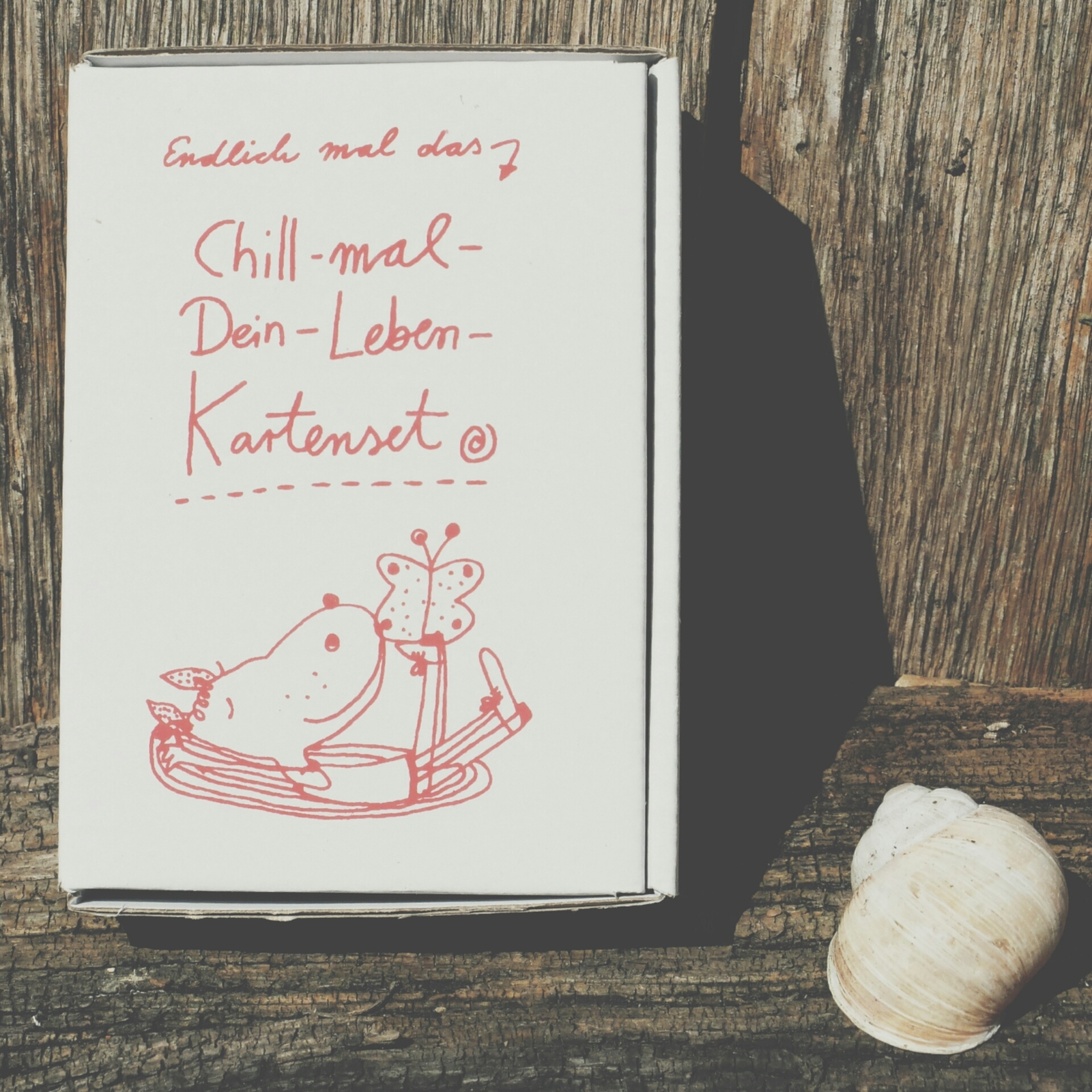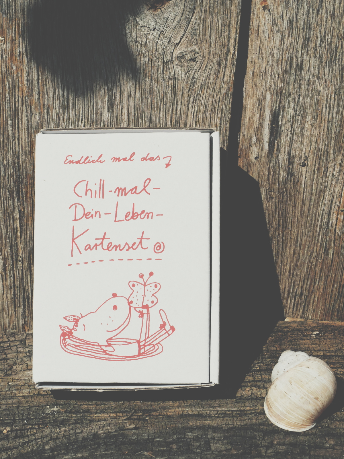 Kartonbox mit der Aufschrift „Endlich mal das Chill-mal-Dein-Leben-Kartenset“