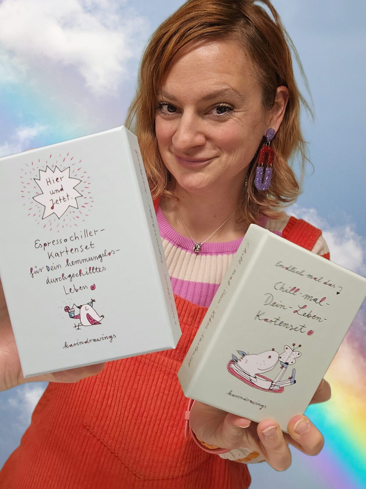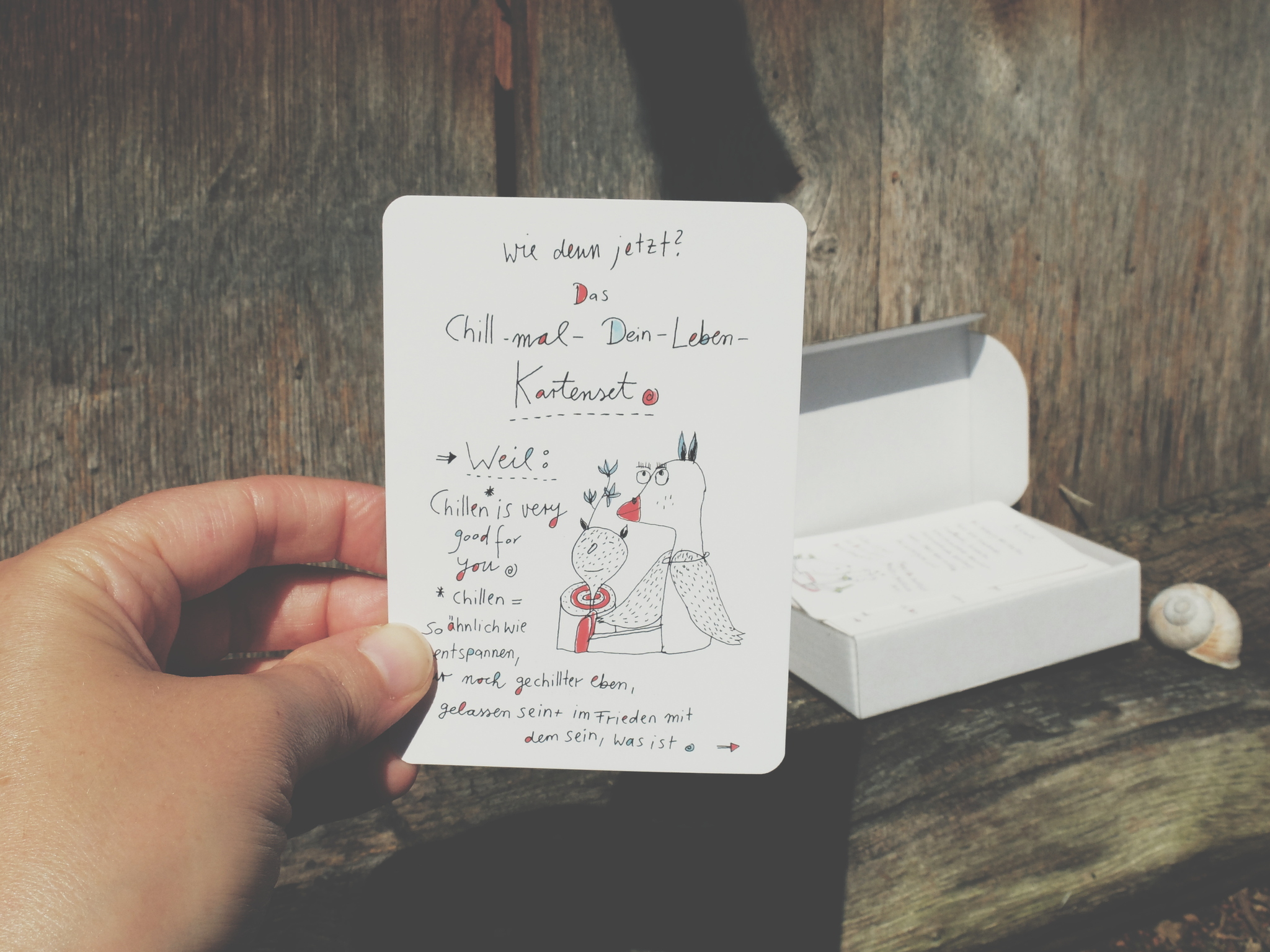 Yippie!! Na endlich! Das Chill-mal-Dein-Leben-Kartenset. Es besteht aus einer reichhaltigen Ansammlung von Karten, die zum Chillfaktor in Deinem Leben extrem beitragen werden. Falls Du also mal angespannt sein solltest, und Du Dein Leben mal wieder zu persönlich nimmst, empfehlen Karin von Karin Drawings und Frau Lotte einmal tief durchzuatmen, und dann eine Karte zu ziehen.