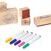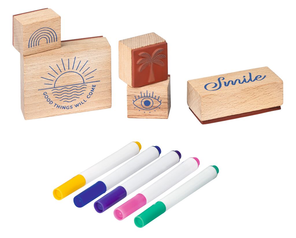- Inhalt: 5 verschiedene Holzstempel, 1 Stempelkissen mit blauer Textilfarbe, 5 bunte Textilstifte (pink, blau, grün, gelb, lila), 3 Geschenkbeutel aus Baumwolle zum Bestempeln