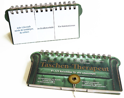 Nach dem SinnfragenKombinator, hier das neuste Produkt aus der animierenden Reihe der Wortmaschinen. Beim Taschen-Therapeut kann man zu allen Fragen, die einen beschäftigen oder gerade in der Luft liegen die passende Antwort finden. Mal ernst und hilfreich, mal witzig und animierend. Der Taschen-Therapeut ist das Produkt der Stunde, gestaltet wie ein bequemes Sofa.