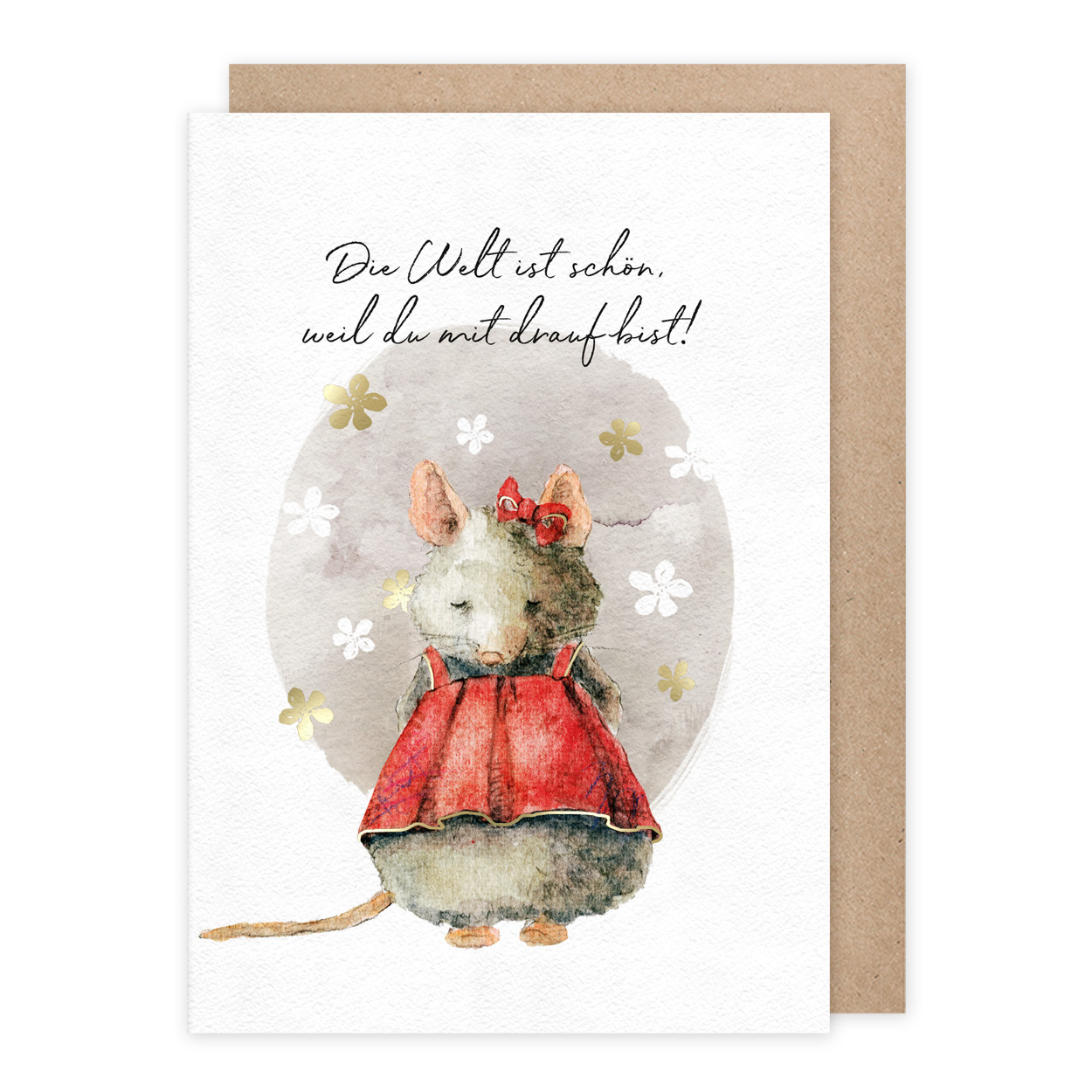 Diese niedliche Doppelkarte bedarf fast keiner weiteren Worte. Die Künstlerin Daniela Drescher zeichnete eine kleine Maus darauf und schrieb darüber: Die Welt ist schön, weil du drauf bist. Und dabei funkeln dem Betrachter kleine Blümchen in Goldfolie entgegen.