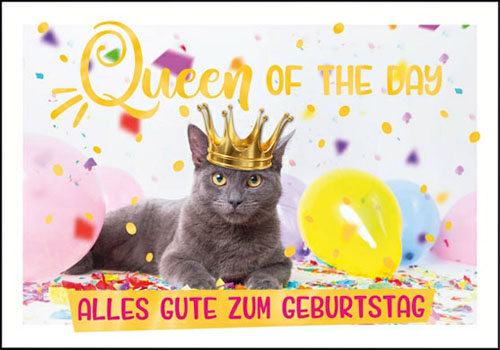 Alles Gute zum Geburtstag für die Queen oft he day! Inmitten von Ballons und Konfetti liegt ein Büsi mit goldener Krone. Die Botschaft ist klar: Lass Dich feiern, am heutigen Tag bist Du die Königin!