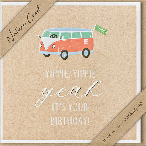 Happy Birthday! Yippie yippie yeah! Die Geburtstagskarte für alle Abenteurer:innen, Autofans und Freigeister. Auf der Innenseite dieser hochwertigen und zugleich umweltfreundlichen Karte findest Du Platz um deine Wünsche mitzuschicken.