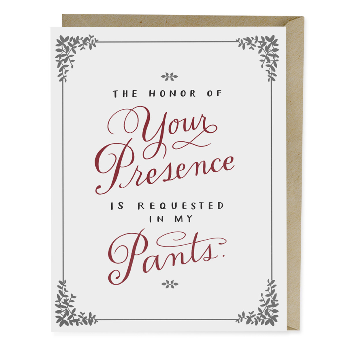 The honor of your presence is requested in my pants. - Um die Ehre Deiner Präsenz wird in meiner Hose gebeten.