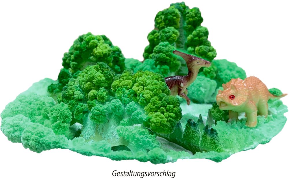 Das Set besteht aus einer Schale, Papierbäumchen, zwei Dinosaurierfiguren, einem Beutel farbigen Sand, einem Beutel weissen Sand, 4 Beuteln Zauberlösung und einer Anleitung.