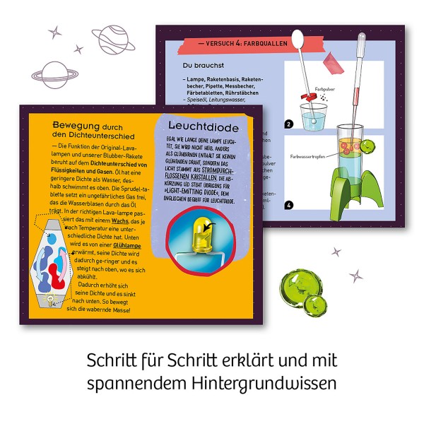 - Inhalt: Anleitung, Raketenlampe bestehend aus Raketenständer, Raketenbecher und Trichterspitze, der LED-Lampe zum Andocken, sowie weiterem Experimentiermaterial wie Pipette, Messbecher, Rührspatel, Färbetabletten