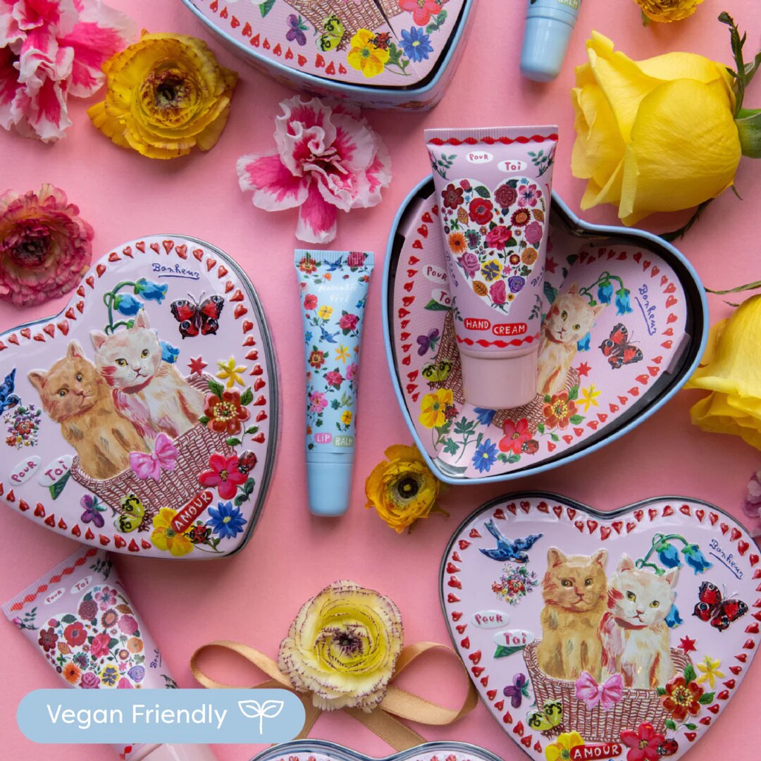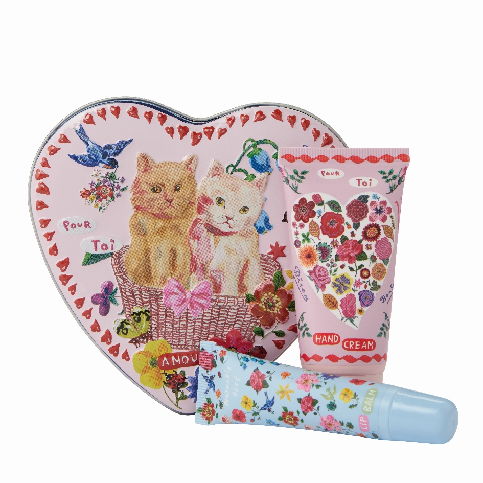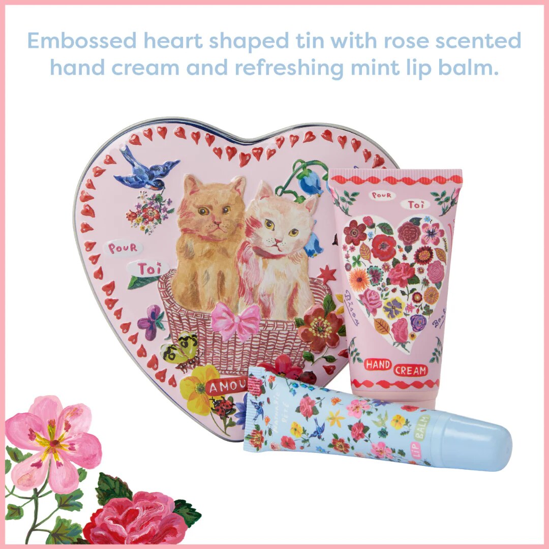 Bezaubernde Herzdose mit Prägung, gefüllt mit nach Rosen duftender Handcreme und erfrischendem Lippenbalsam mit Minze. Das perfekte Geschenk für Tierliebhaberinnen mit den bezaubernden handgemalten Kätzchen, Vögeln und Schmetterlingen der Künstlerin Nathalie L’été!