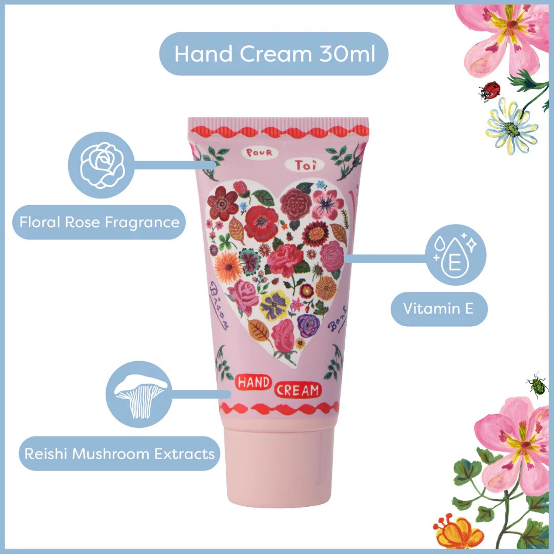 Diese herzförmige Dose mit Prägung enthält eine nach Rosen duftende Handcreme und einen köstlichen Minz-Lippenbalsam, entworfen von der Künstlerin Nathalie Lété.