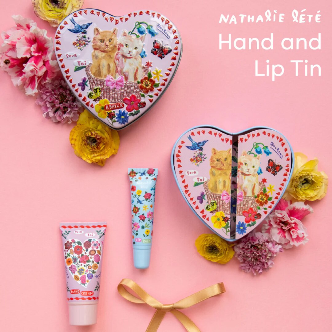 - Enthält: Dekorative Blechdose in Herzform, gestaltet von der Künstlerin Nathalie L’été, 30 ml Handcreme, 10 ml Lippenbalsam