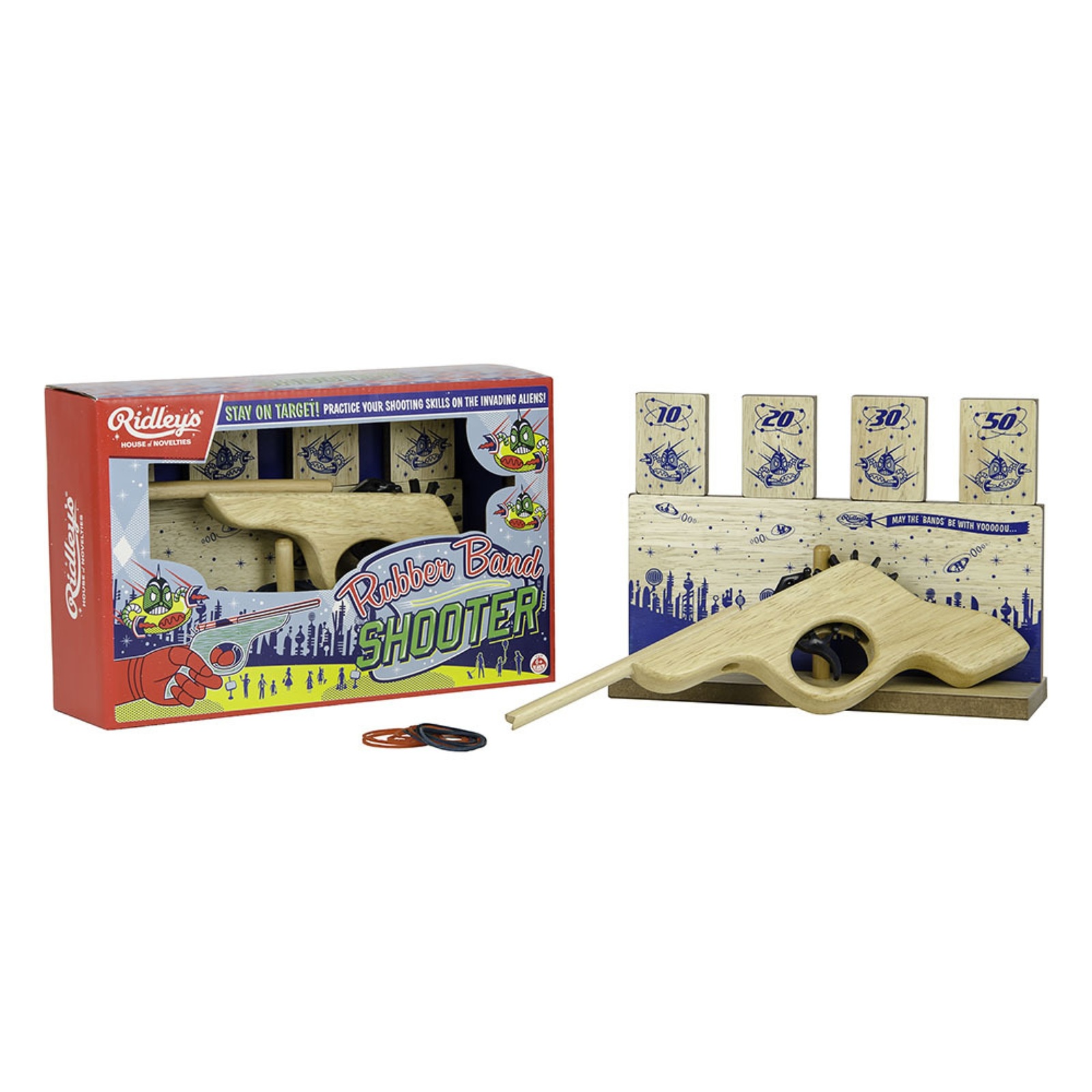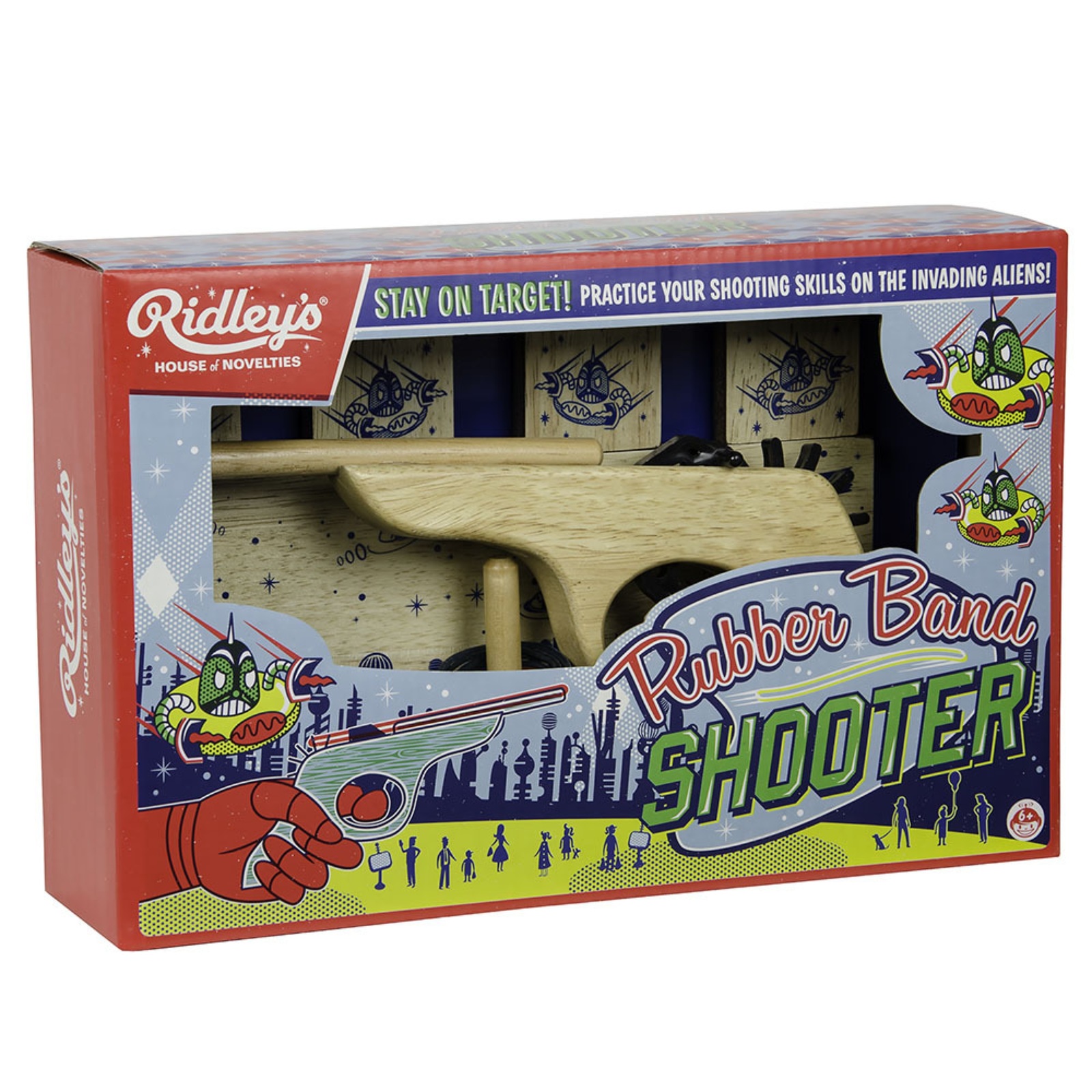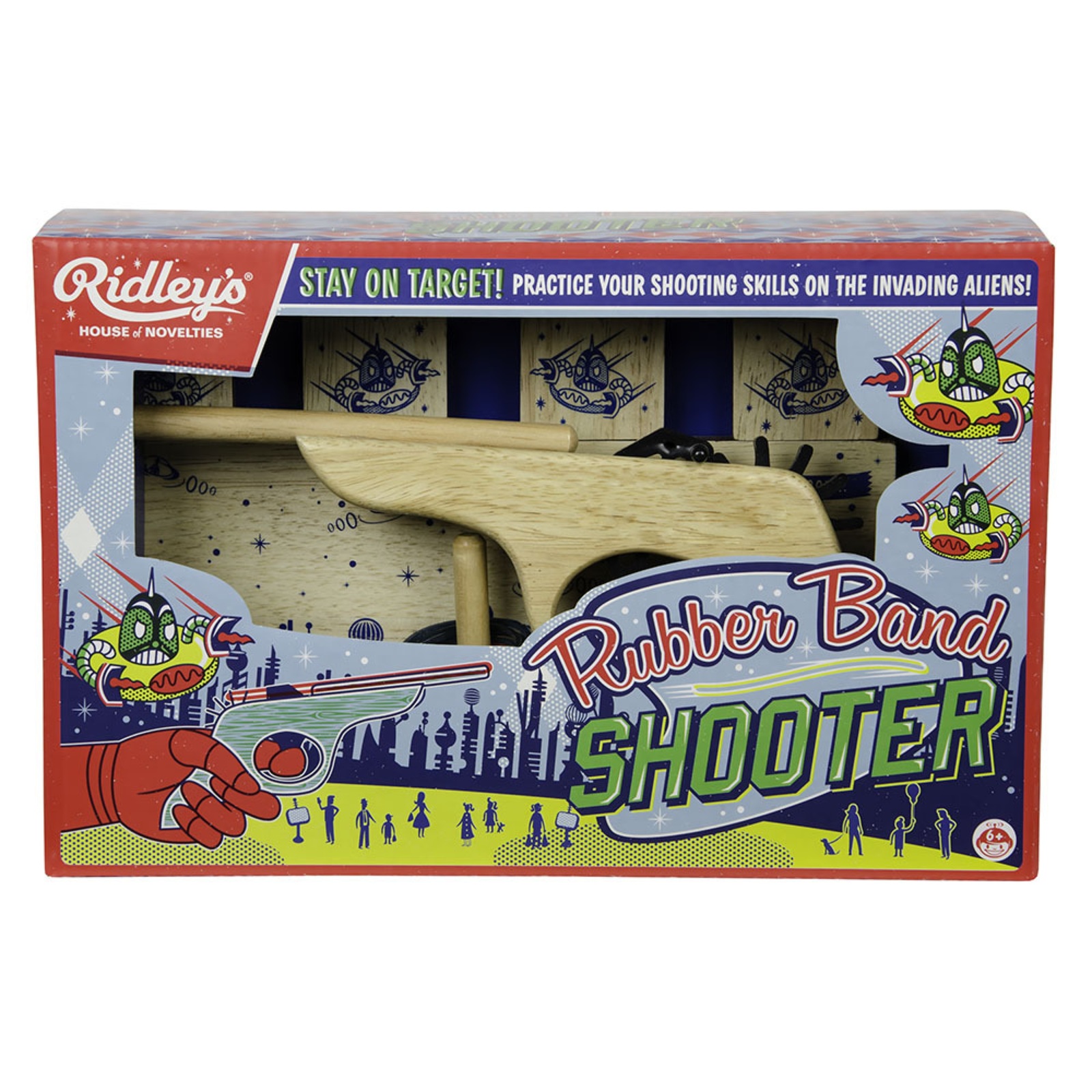 Huiii, die Erde wird von bösartigen Aliens angegriffen! Hast DU das Zeugs zur*m Retter*in unseres Planeten? Teste Deine Helden*innen-Qualitäten mit dem Rubber Band Shooter von Ridley’s! Das all-time-favourite-game in der witzigen Version mit Ausserirdischen.