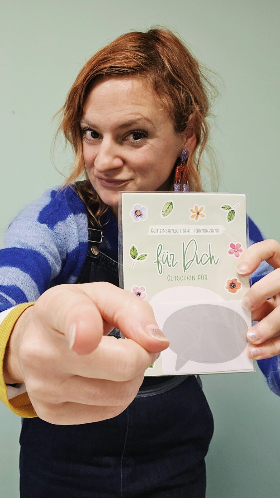 Das persönlichste Geschenk überhaupt: schenke Deine Zeit! Oder wie es auf dieser hübsch designten Postkarte steht: Gemeinsamzeit statt Krimskrams. Einfach Deine Idee in die leere Textblase schreiben und den beiliegenden Rubbelsticker drüber kleben – fertig. So erhält der beschenkte Lieblingsmensch eine kleine Überraschung, da erst noch frei gerubbelt werden muss, was er:sie denn bekommt :-)