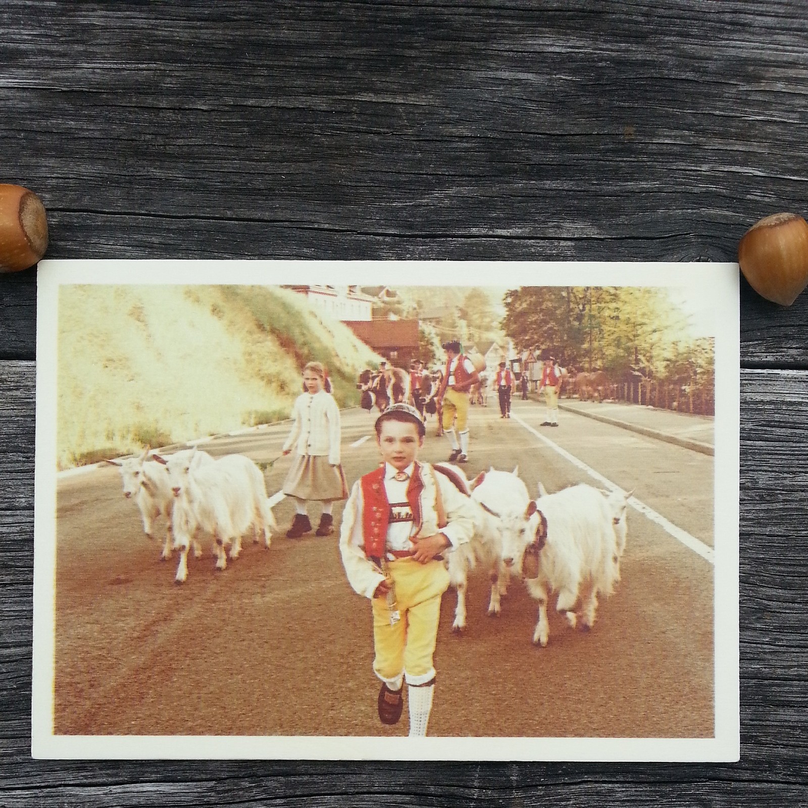 Einzigartige Holz-Karte mit einzigartigem Sujet drauf: einem typischen Schweizer Geissenbueb mit seinen Geissen (=Ziegen). Die etwas andere Karte aus der Schweiz.