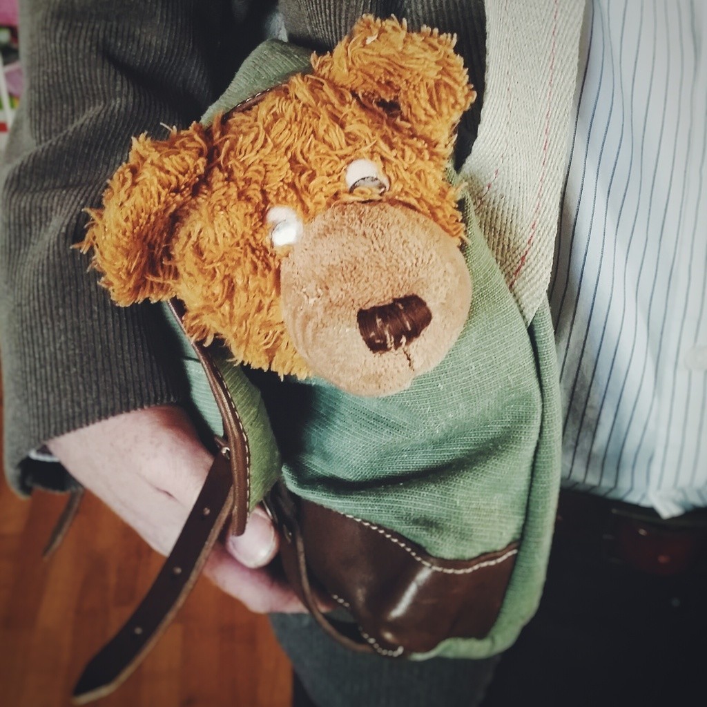 Das ist Ach, der Bär. Lottchen hat ihn auf ihre Geburt von einer Nachbarin erhalten. Marili hiess die Nachbarin und sie erzählte uns, dass sie ALLEN diesen Bären verschenkt, weil er sich bewährt habe. Tatsächlich trafen wir einmal im Hause anderer Nachbarn auf einen (wesentlich besser erhaltenen) Bären der gleichen Art. Lottchens heisst Ach, weil dies einer der ersten Laute war, welcher ihr über die Lippen kam und irgendwie ist das geblieben. Seit Lottchen munzig-winzig-klein ist, hängt sie an Ach. Es gibt Bilder, wo beide noch gleich gross sind. Ach war zwischendurch mal ein Bärenmädchen und hat auch öfters mal einen Wechsel im Charakter. Derzeit ist er eher unverschämt und macht viel Blödsinn. Wird Lottchen gemahnt etwas leiser zu sein, ist es meistens Ach, der für den Lärm verantwortlich ist zum Beispiel. Dass er eine ausgesprochen liebevolle Seite hat, bewies er diese Woche. Da ist das Marili mit Mitte 80 und dennoch unerwartet gestorben. Ach erklärte über Lottchen, dass er auch an die Beerdigung gehen möchte. Also nahm ihn Herr Lotterich in seiner Tasche mit. Er war sehr traurig Abschied von seiner Bärenmama zu nehmen. Aber immerhin munterte seine Anwesenheit die anderen Trauergäste ein bisschen auf - etwas vertrautes im Angesicht des grossen Unbekannten, schliesslich besitzt doch das halbe Dorf einen solchen Bären dank Marili.