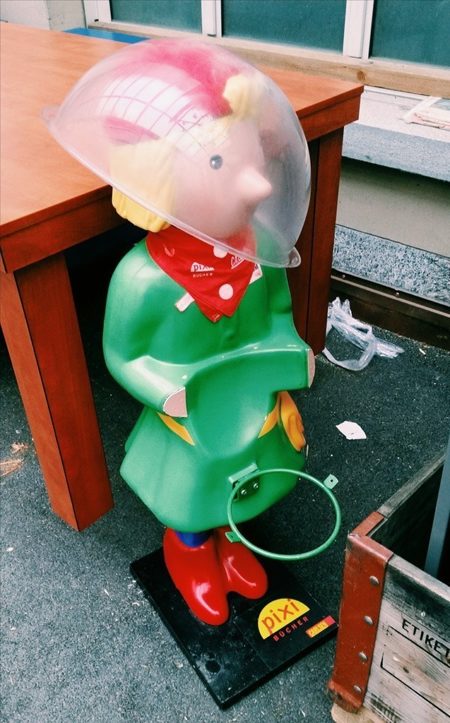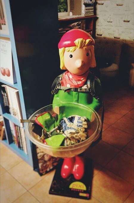 Hier steht Pixi schon in seinem neuen Zuhause. (Derzeit ist er Rucksack- und Gartenhandschuhe-Halter.)