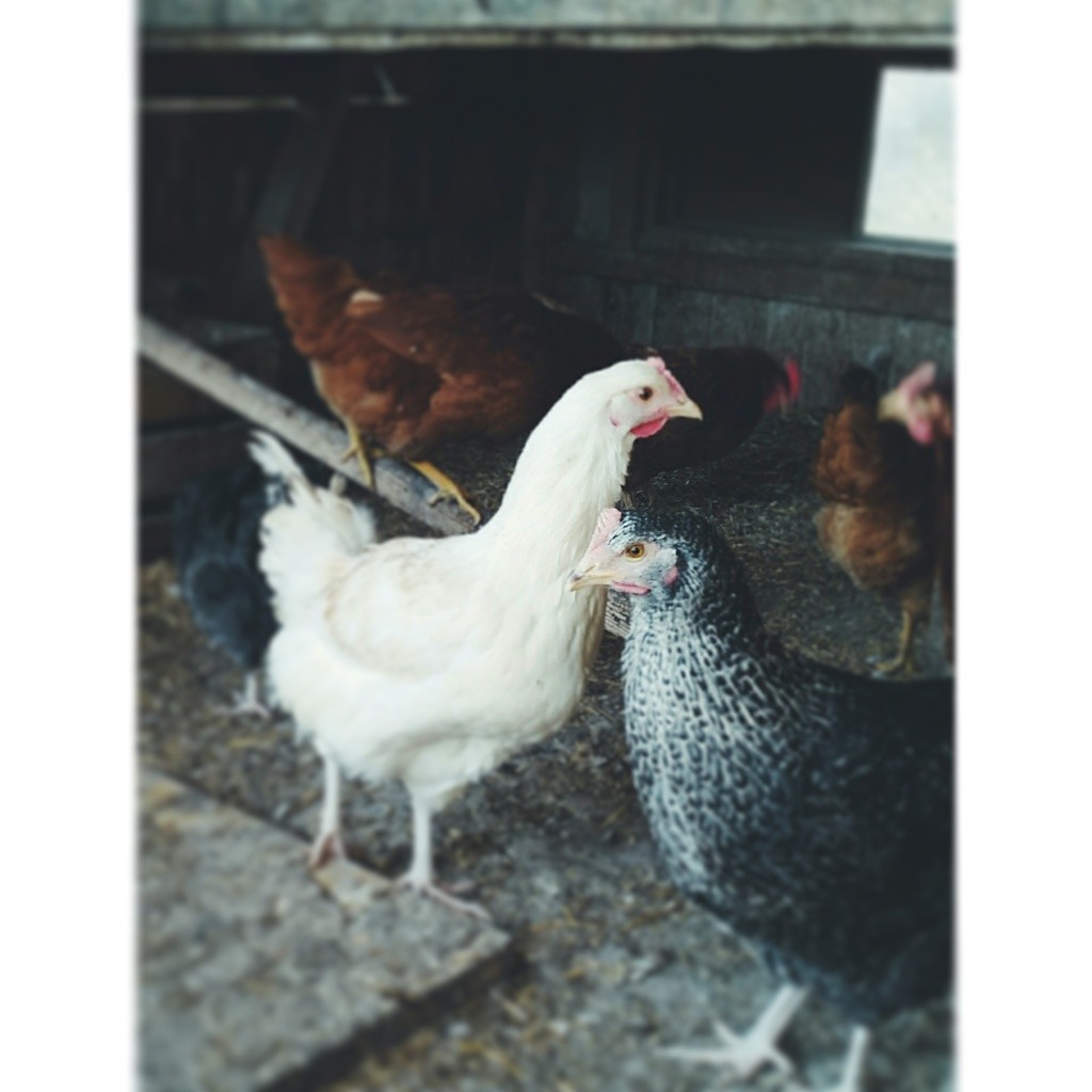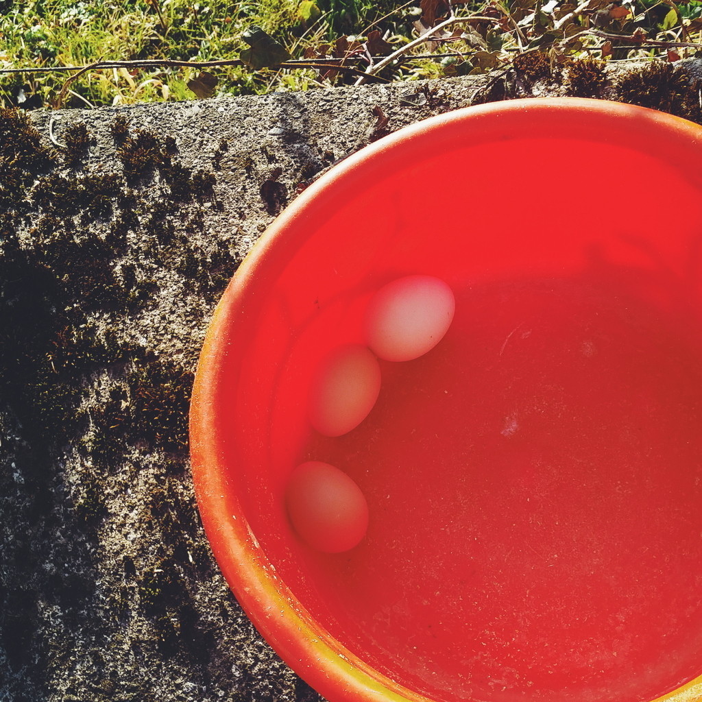 Die jungen Hennen legen noch kleinere Eier und auch noch nicht fast-täglich. Das weisse Ei ist von einem der beiden "Heldinnen unseres Hühnerhofs" (wie wir sie mit Ehrfurcht nennen).