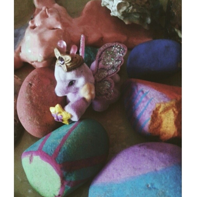 Wir waren am See unten. Dort gibt es nämlich magische Steine! Gut die Augen offen halten und daheim dann anmalen. Voilà. Jetzt haben wir einen Teller voll davon. Man weiss nie, wann man so einen brauchen kann.