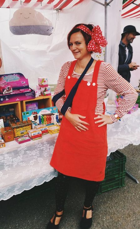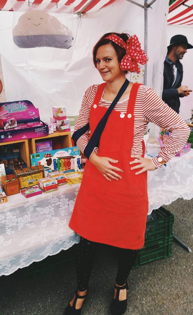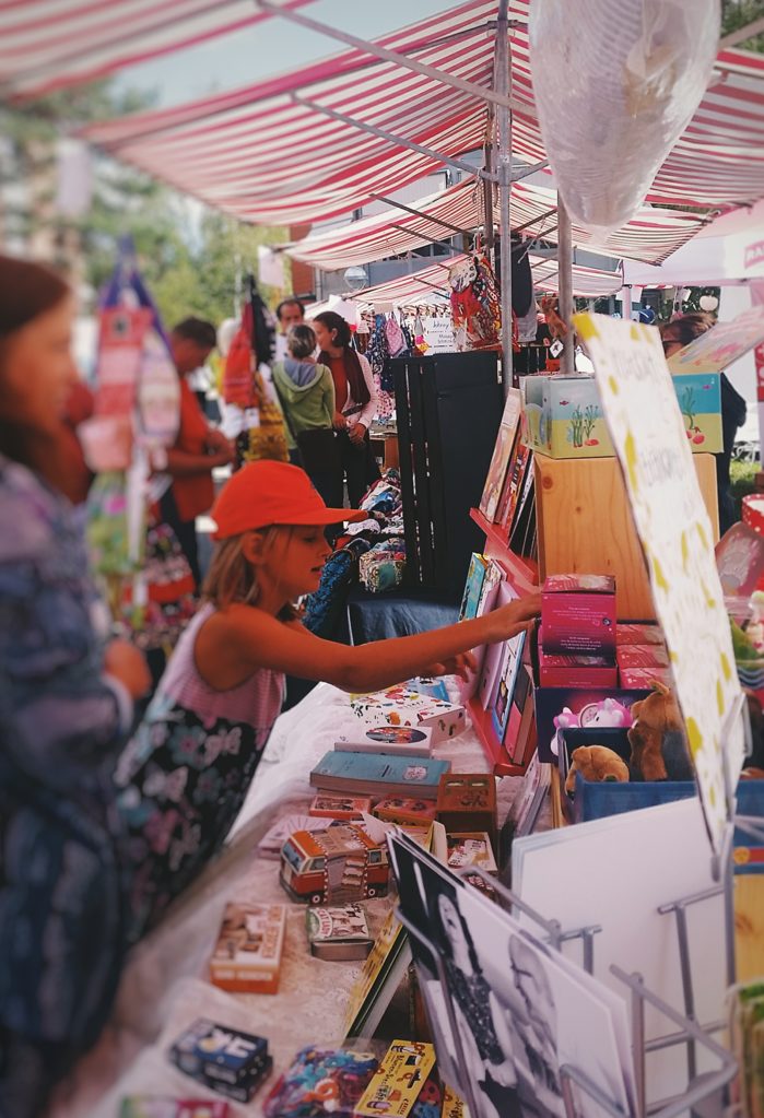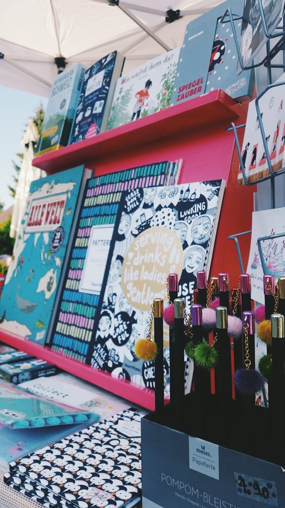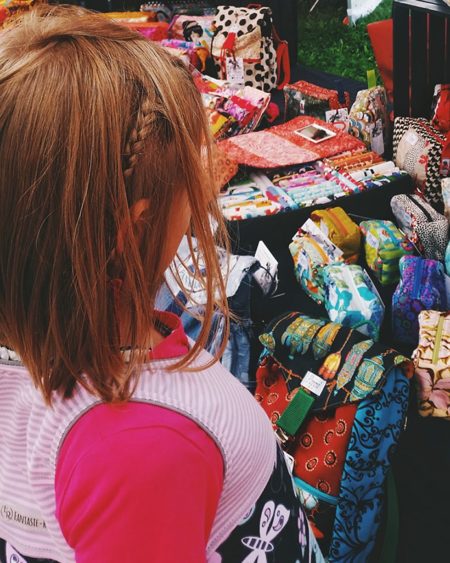 Hier wirft Lottchen einen Blick auf den Nachbars-Stand, an dem die kreative Carla ihre fröhlichen Poppi Taschen verkauft.