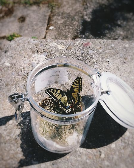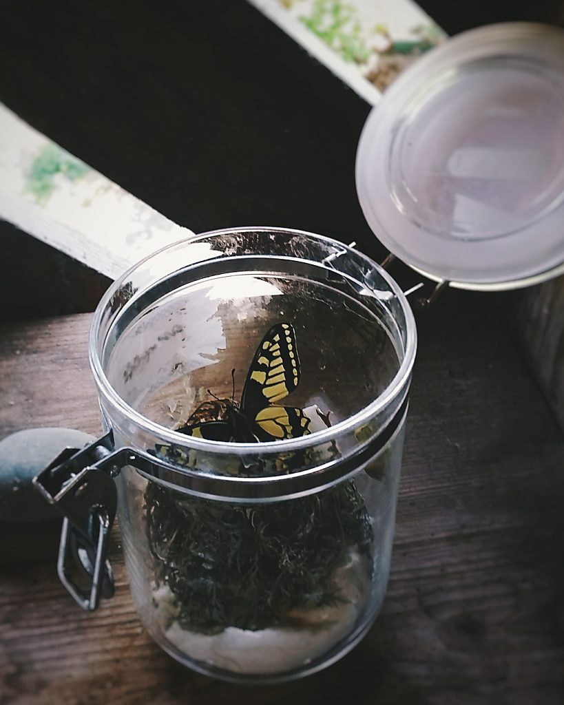 Ende Oktober letzen Jahres fand Lottchen eine Raupe und beschloss, ermutigt durch ein Schulprojekt, diese bei uns durchzufüttern. Als Raupen-Villa wurde eine alte Tee-Dose vom Grosmueti umgenutzt. Täglich wurde jetzt frisches Rüeblikraut herangeschleppt und dem Räupli in die Dose gelegt (aber erst nachdem ausgemistet wurde, was dann meistens Frau Lotte machen durfte). Nach etwa 2 Wochen, als Lottchen's Begeisterung für dieses Projekt schon ziemlich geschwächt war, verpuppte sich die Raupe. Die Dose wurde zum Überwintern aufs Fensterbrett gestellt. Und dort geriet sie in Vergessenheit, bis sich vor kurzem der Frühling mit den ersten Schmetterlingen zeigte. Ein Blick in die Villa Schmetterling zeigte: keine Veränderung. Noch immer hing die verpuppte Raupe am Glas, genau gleich wie im November schon. Beinahe hätte Frau Lotte sie darum schon entsorgt, doch Lottchen hielt Einspruch. Und 1 Tag darauf schlüpfte ein prächtiger Schwalbenschwanz! Diese kleinen Wunder, die uns begleiten. Dankeschön dafür.