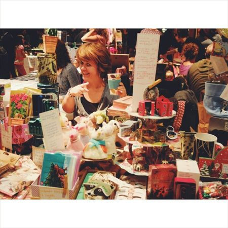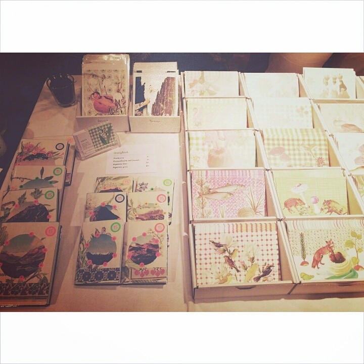 Neben uns hatte Tatiana von Maiglück ihren Stand. Ein fröhlich buntes Meer von ihr in Handarbeit gestalteten Postkarten und Agendas erstrahlte da.