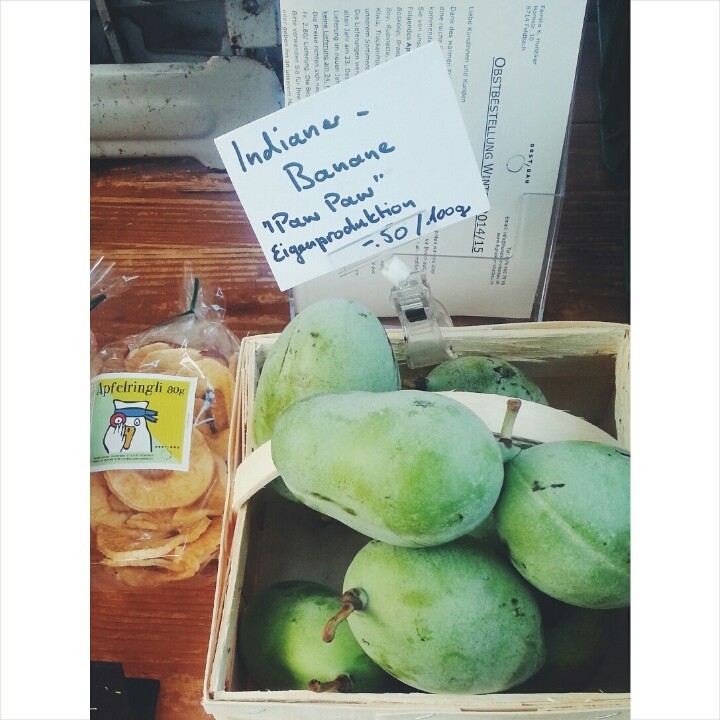 Auch die Paw Paw ist im Angebot. Diese Frucht kommt aus Nordamerika (daher auch "Indianerbanane" genannt) und wächst ebenfalls auf Herrn Lotterichs Obstplantage. Man schneidet sie auf, nimmt die grossen Kerne heraus und löffelt sie dann aus. Schmeckt so ein bisschen nach Mango. Und interessant: man liebt sie oder man kann nix mit ihr anfangen. (Lottchen gehört zu den ersteren, Frau Lotte zu den letzteren).
