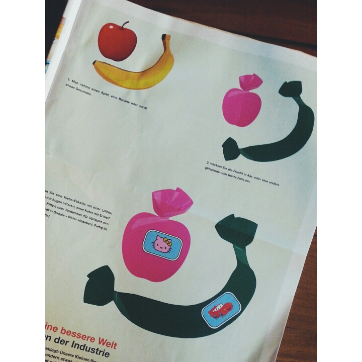DIY Obst für heikle Kinder Im Strassenmagazin Surprise entdeckt: wie heiklen Kindern Obst schmackhaft gemacht werden kann. Einfach Apfel, Banane und Co. in buntes Papier einwickeln und fancy Kleberli drauf und schon ist die altmodische Frucht ein hippes Teil geworden. ;-) |