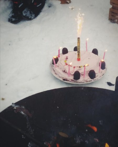 Den Geburtstagskuchen gab es draussen. Zwar beim wärmendem Feuer, dennoch war er so kalt, dass er als Glace-Torte durchgehen konnte. Schwein gehabt, denn Lottchen hatte sich eigentlich auch Eiskrem gewünscht.