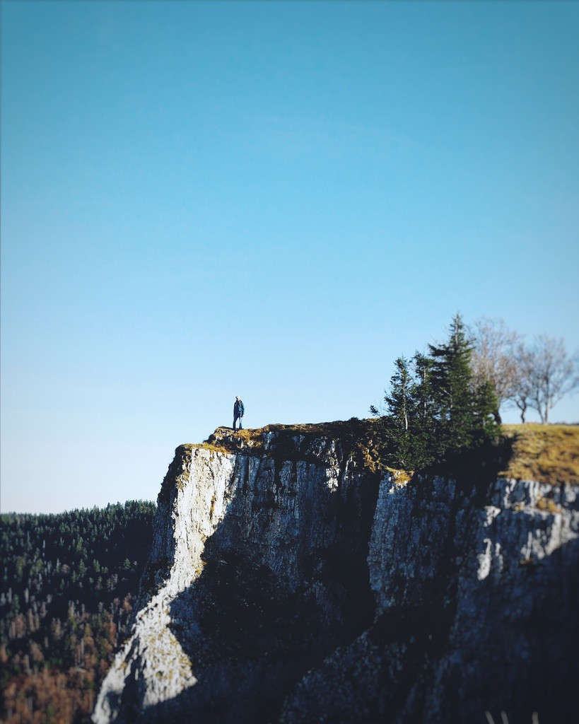 Aber vor allem wollten Herr und Frau Lotte endlich den creux du van mit eigenen Augen sehen. Das hier ist Herr Lotterich auf einem Felsvorsprung. Schon noch beeindruckend, oder? Dass nicht Frau Lotte dort steht, hat seinen Grund: unter ihr hätte der Fels wohl nachgegeben. Sie hat sich nämlich schaurig über den französischen Einschlag auf der Speisekarte gefreut und dies auch ausgenutzt. In einer perfekten Welt gäbe es immer pains aux raisins zum Zmorge, ist sich Frau Lotte sicher.