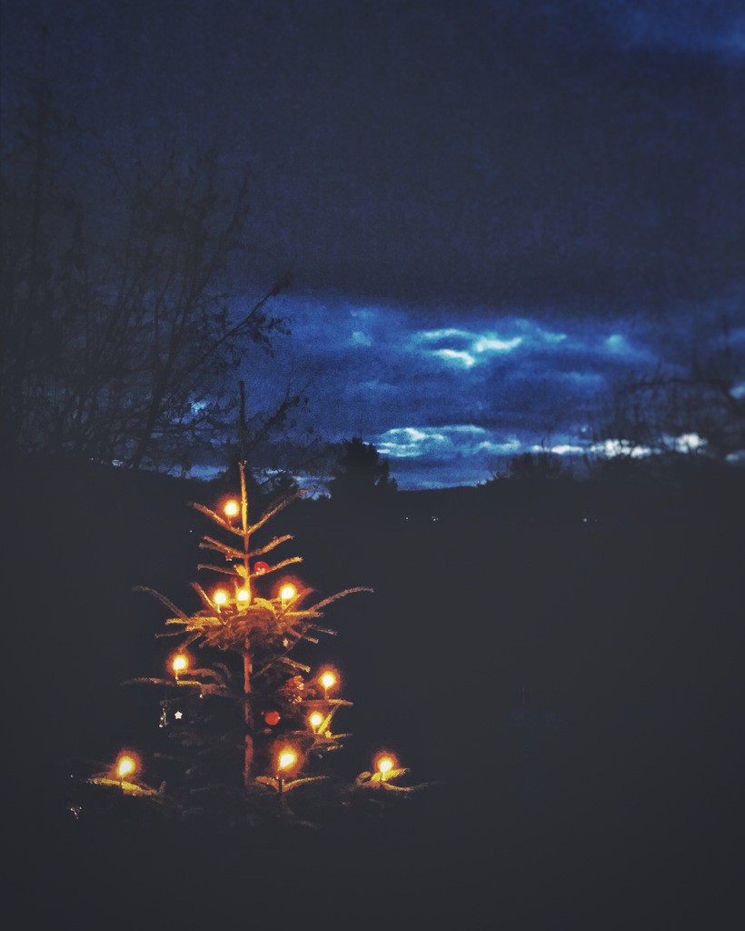 Weihnachten im Wunderland. Zum ersten Mal mit Baum! Wegen Büsis und Hund und so steht er draussen im Garten und nicht in der Stube (fabelhafter Tipp von einem Gschpänli!). Die roten Christbaumkugeln sind übrigens Jonathan-Äpfel - eine Idee von Herrn Lotterich und ausgeführt vom Lottchen. Frohe Festtage!