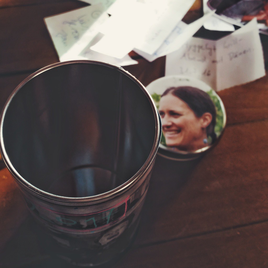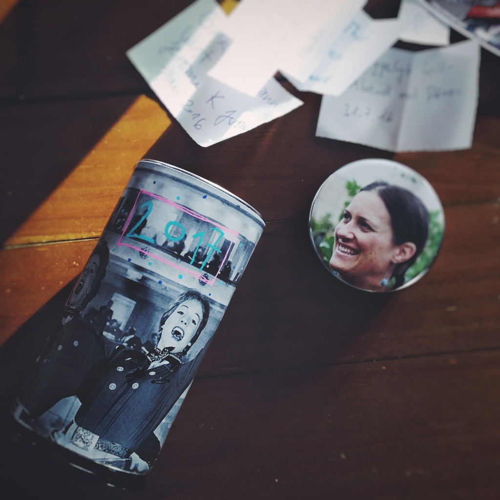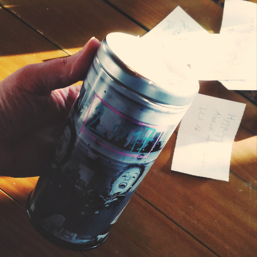 Das ist die 2017-Büchse. Hier kommen tolle Erlebnisse, Bücher, Musik, Konzerte, Begegnungen auf Papier notiert und mit Datum versehen rein. (Im Hintergrund sind die Schnipsel aus der 2016 Büchse zu sehen.)