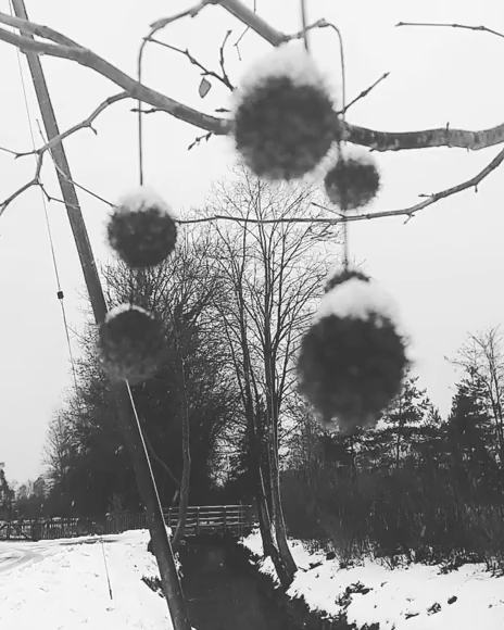 Diese Kugeln hat Frau Lotte beim Gassi gehen entdeckt. Sie haben sie total fasziniert, wie vergessener Weihnachtsschmuck hingen sie in der kargen Landschaft. Natürlich hat Frau Lotte angemessen reagiert: sofort mit dem Handy festgehalten und die Internetgemeinschaft gefragt, was das nur ist. Reihum wurde gestaunt, aber gewusst hat es niemand. Bis auf den Nachbarn, der sich wunderte, warum Frau Lotte dermassen in ihrem Handy herumtippte. Es ist eine hundsnormale Platane. Wie so oft - die Magie liegt im Alltäglichen.