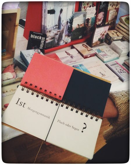 Ein richtiges Verwöhnprogramm, also! Dies spiegelte sich auch auf den zufriedenen Gesichtern wider. Um die Bodenhaftung nicht komplett zu verlieren, blätterten die nette Standnachbarin von Frau Lotte, Dominique von EinzigArtigs, und ihre Tochter Mathilda (ebenfalls sehr nett) im Sinnfragenkombinator. Ja, wie ist denn das: Ist Morgengymnastik Fluch oder Segen? Frau Lotte ist zu keinem Schluss gekommen. Aber was sie jetzt weiss: mit einem Gläschen Prosecco in der Hand gewinnt diese Frage eindeutig an Brisanz! ;-)