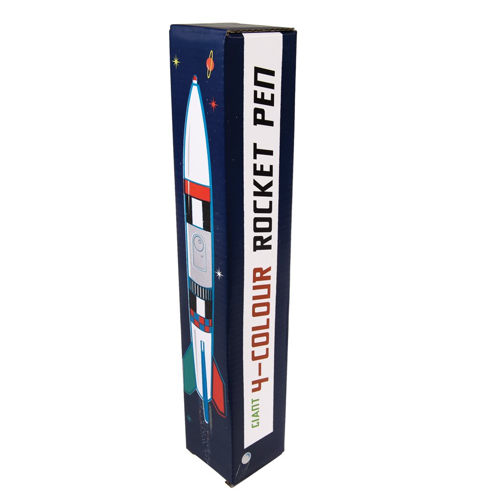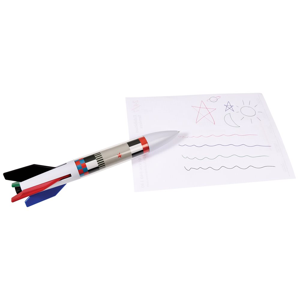Neu im Schreibwarensortiment von Rex: supercooler Riesenkugelschreiber in Form einer Rakete. Mit 4 Minen in verschiedenen Farben - einfach einen Flügel der Rakete herunterdrücken, um die entsprechende Farbe auszuwählen.