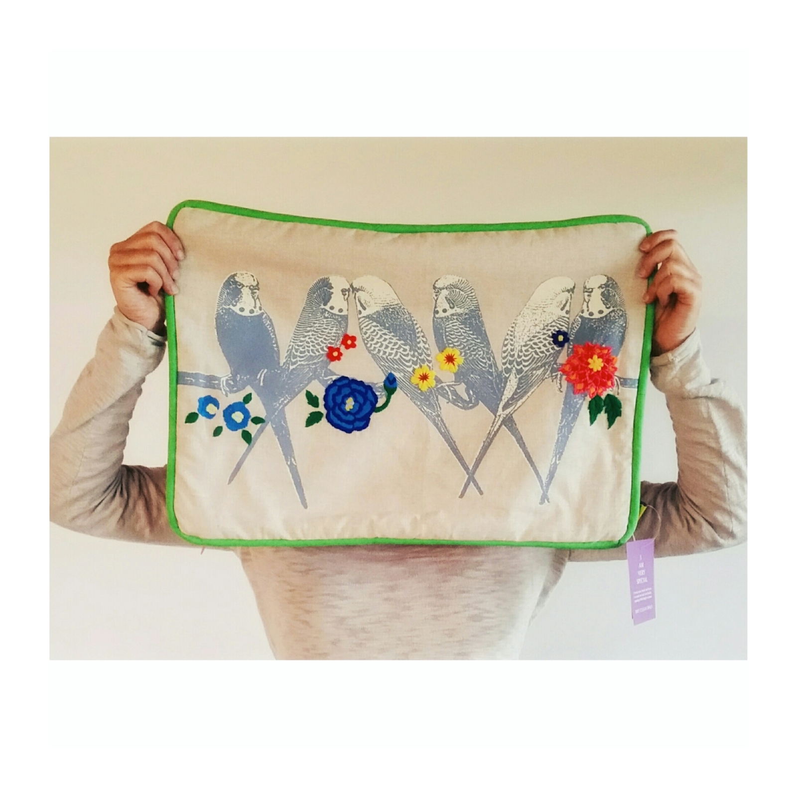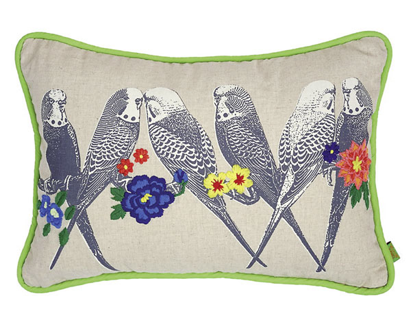 Neuerdings sitzen 6 Wellensittiche bei Frau Lotte auf der Couch. Also auf diesem einzigartigen Kissen, nicht direkt auf der Couch :-) Die bunten Blumen dazwischen sind aufgenäht und sind ein absoluter Eyecatcher! Eingefasst ist das ganze von einem grünen Band und in schönem Kontrast ist die Rückseite ganz in altrosa gehalten und zwar mit Samststoff.