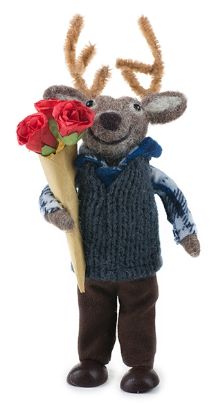 - handgefilzter Hirsch mit einem Rosenbouquet in der Hand