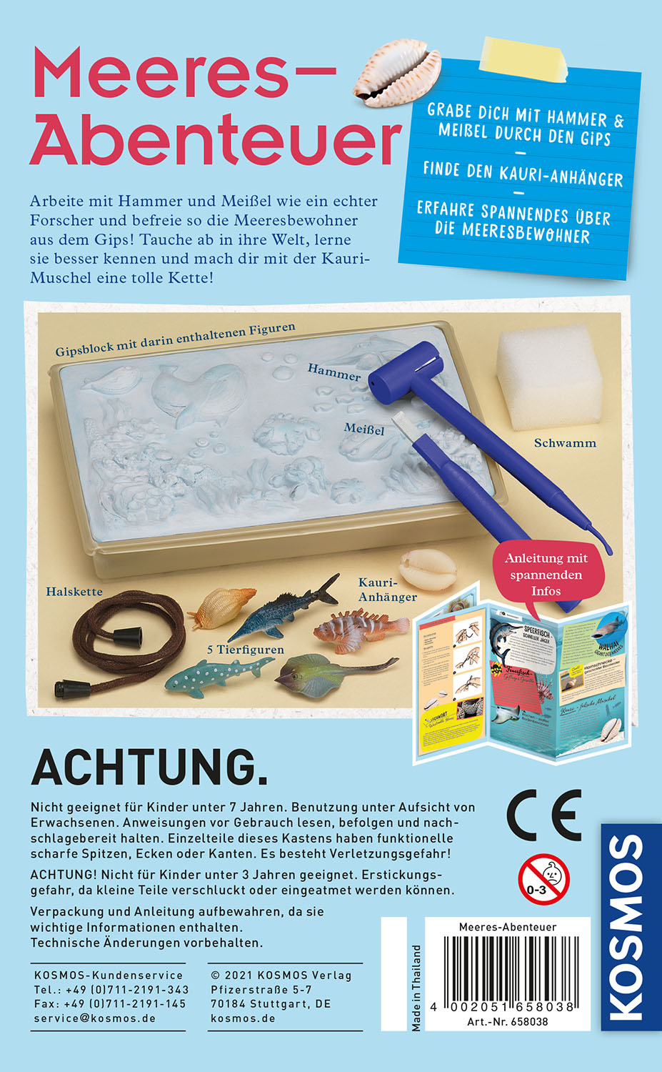- Inhalt: blauer Gipsblock mit Relief und Glitterfischen, enthält 5 verschiedenen Figuren von Meerestieren (Walhai, Rochen, Hornschnecke, Feuerfisch, Speerfisch) sowie eine Kauri-Muschel als Kettenanhänger, Schnur, Werkzeug (Hammer, Meissel), Schwamm, farbig illustrierte Anleitung