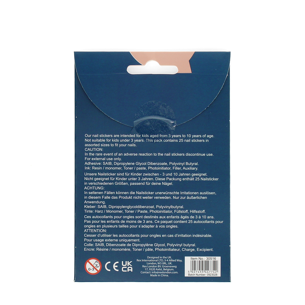 - Die Sticker sind in verschiedenen Grössen gedruckt, so dass die verschiedenen Fingernägel (Daumen, kleiner Finger etc.) sowie die verschieden grossen Finger (je nach Alter vom Kind) berücksichtigt sind.