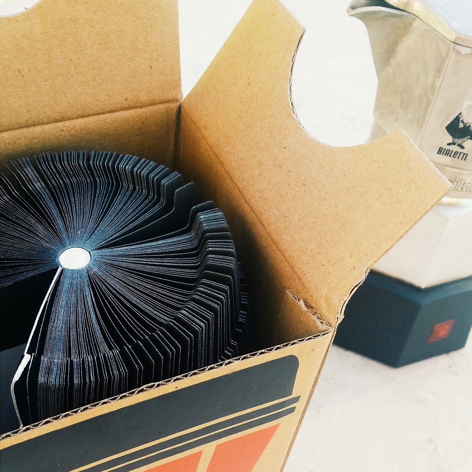 Der Karton misst ca. 9 x 13 x 9 cm und hat rundum witzige Aufdrucke zum Thema „Kaffee zum Mitnehmen“ – so steht z.B- auf dem Deckel oben sinngemäss auf deutsch „VORSICHT es brauen sich innen Ideen zusammen“ (Caution: ideas brewing inside)